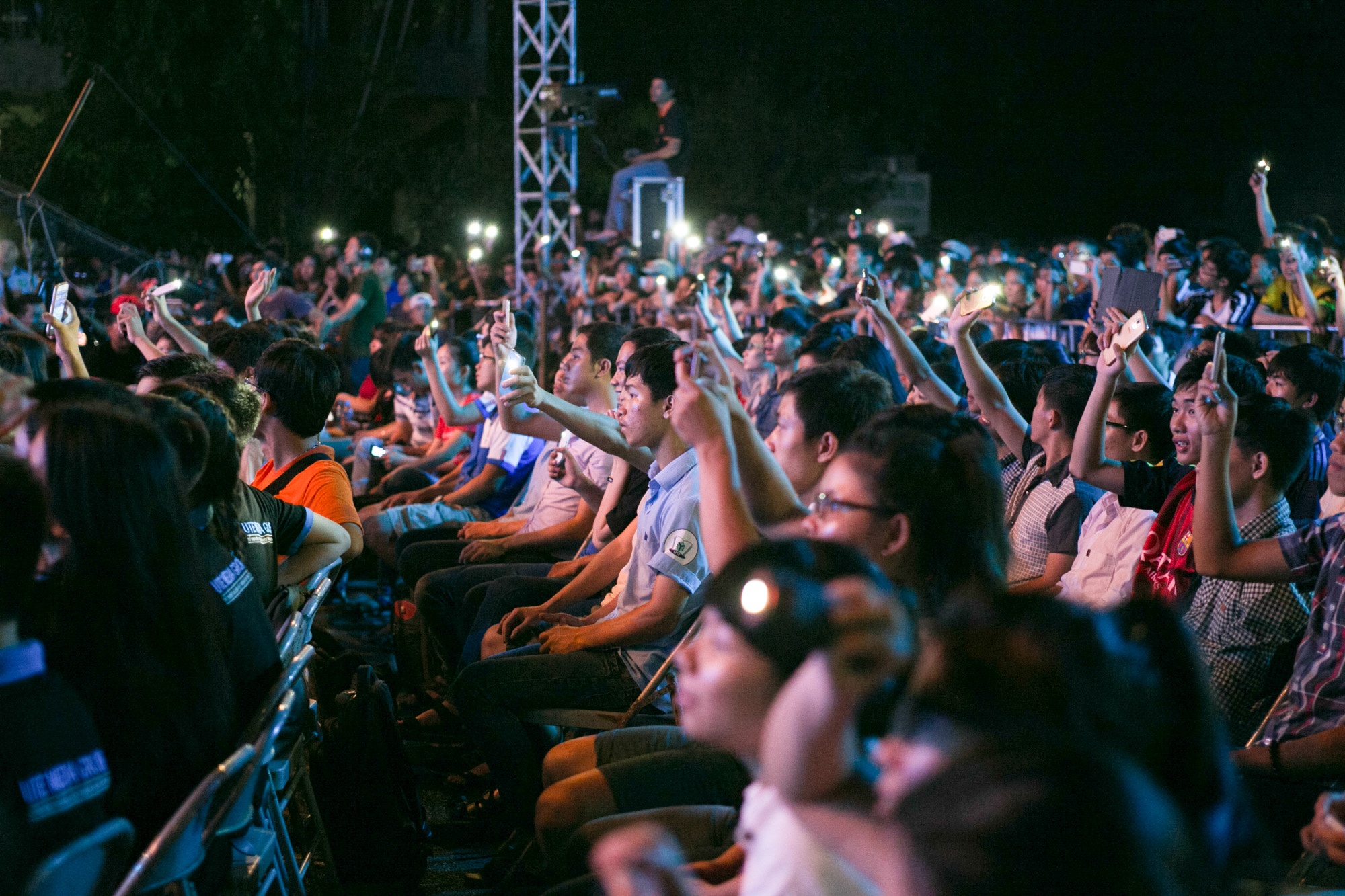 | Hàng nghìn bạn sinh viên chăm chú theo dõi phần trình diễn của Trọng Hiếu và các thí sinh Học viện ngôi sao. |