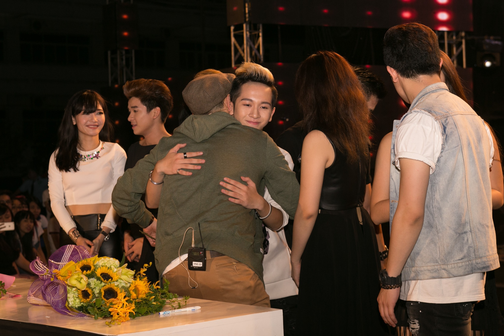 | "Tình cảm, sự tri ân bất ngờ và ấm áp hôm nay thực sự khiến tôi cảm động. Nó giống như một động lực cho công việc, cuộc sống của tôi", anh cho biết thêm. Trong ảnh, Đỗ Hoàng Dương - một thí sinh của Học viện ngôi sao ôm chặt nhạc sĩ Huy Tuấn thay lời chúc mừng. |