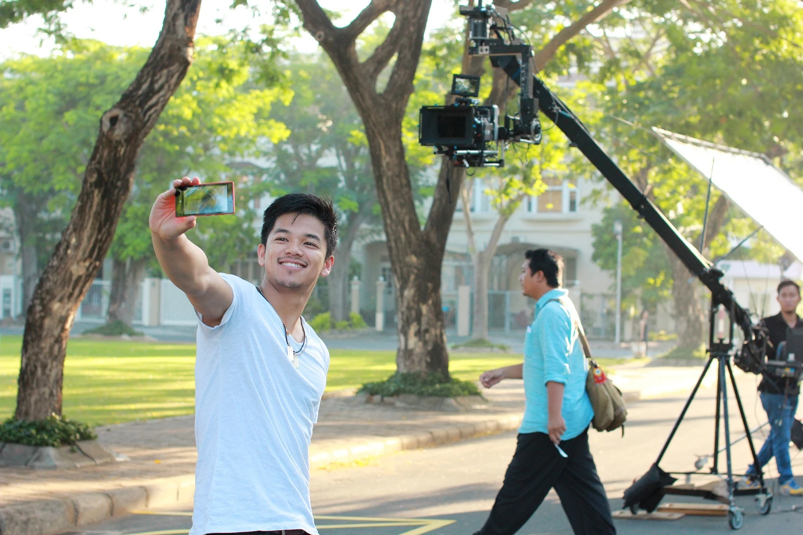 | Trọng Hiếu bảo, quay phim cả ngày, thời gian chờ đợi lâu khiến bản thân rất mệt mỏi nhưng thay vì ngồi ủ rũ, anh vui vẻ và tạo trò sẽ khiến tinh thần hưng phấn hơn. |