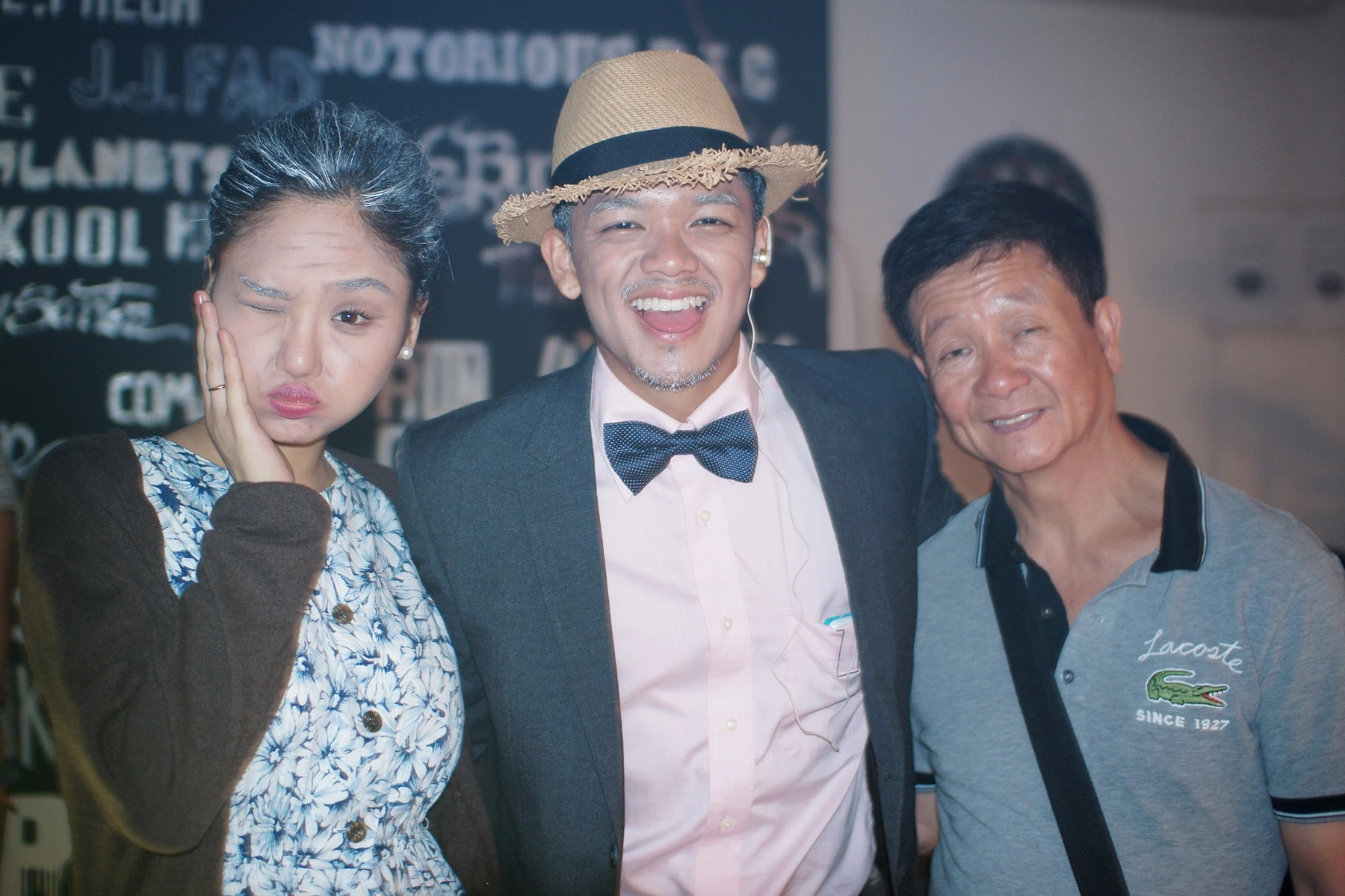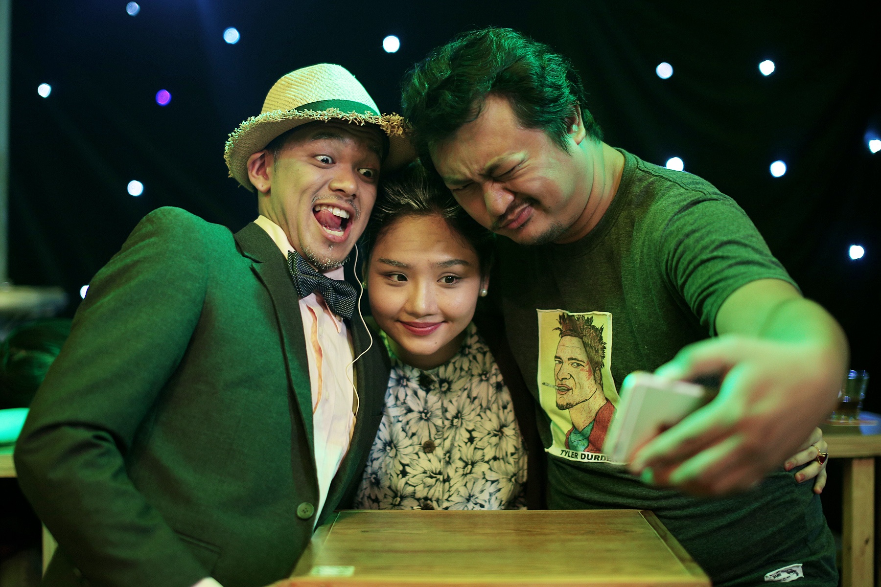 | Đạo diễn Phan Gia Nhật Linh khác hẳn lúc ngồi trước monitor, anh vui vẻ, tinh nghịch cùng các diễn viên chính. |