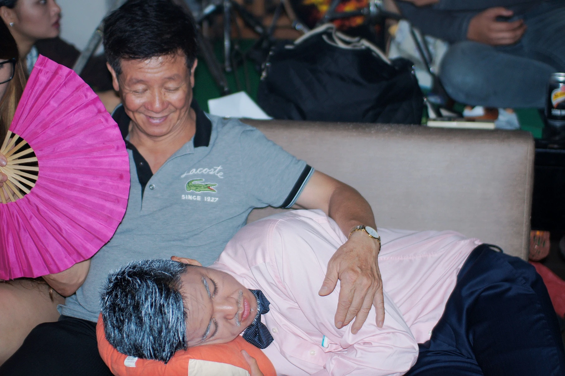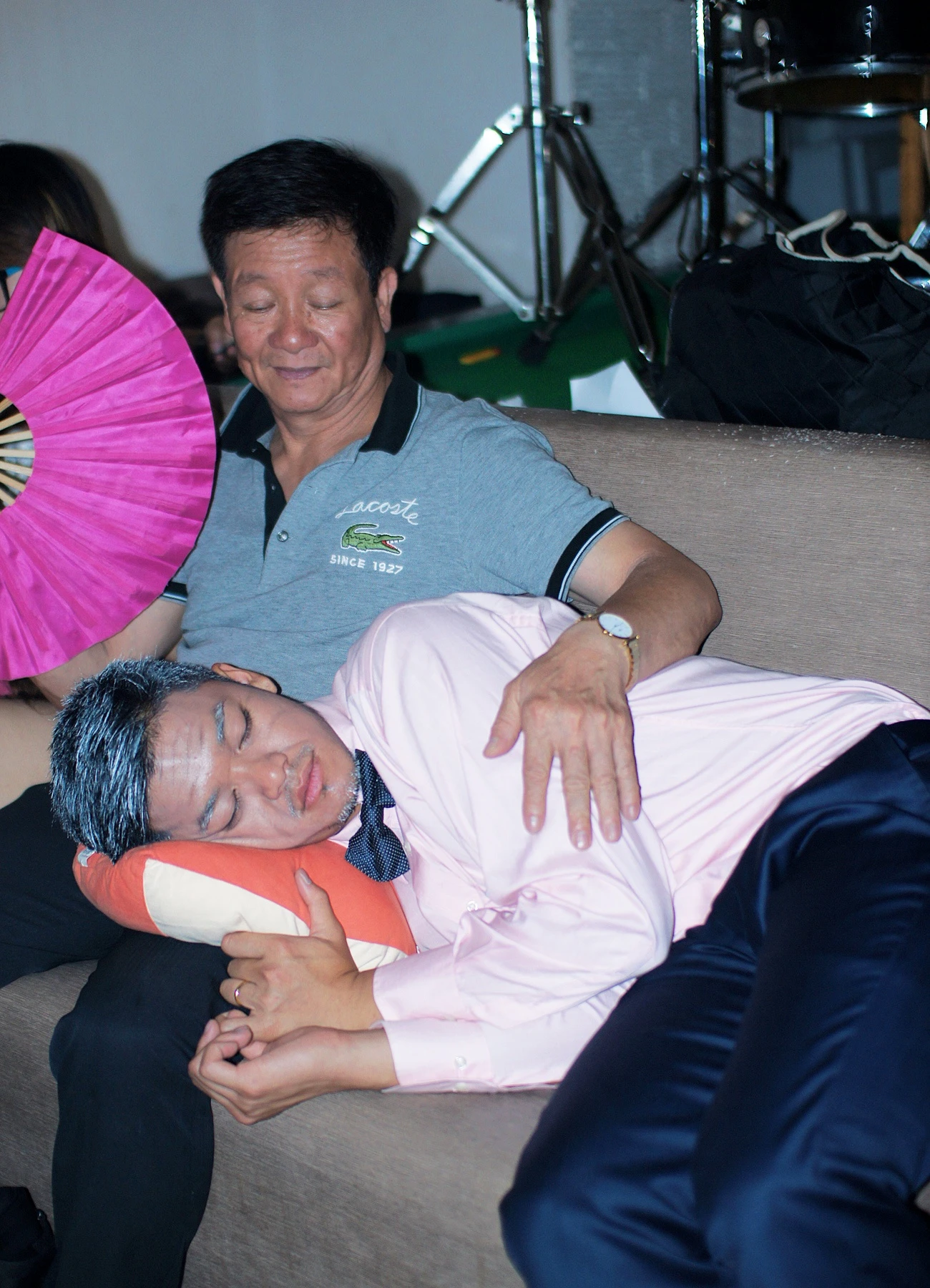 | Sau những cảnh quay căng thẳng, Trọng Hiếu vô tư gối đầu lên đùi bố ngủ. |