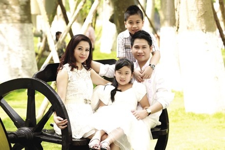 | Trọng Tấn bên vợ và 2 con nhỏ. |
