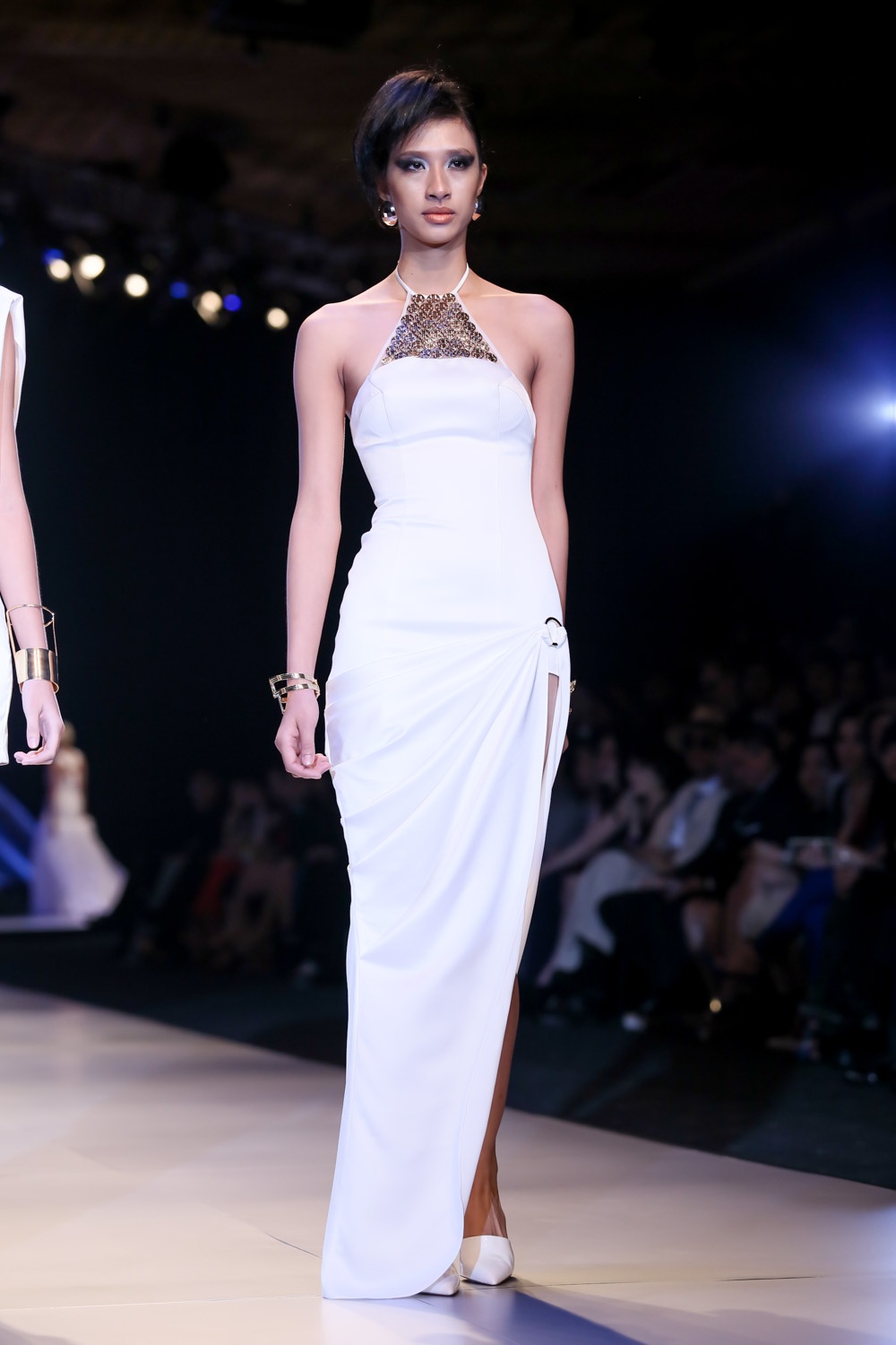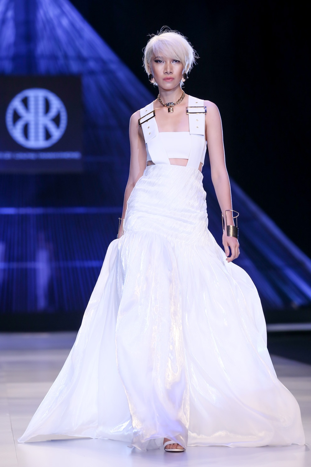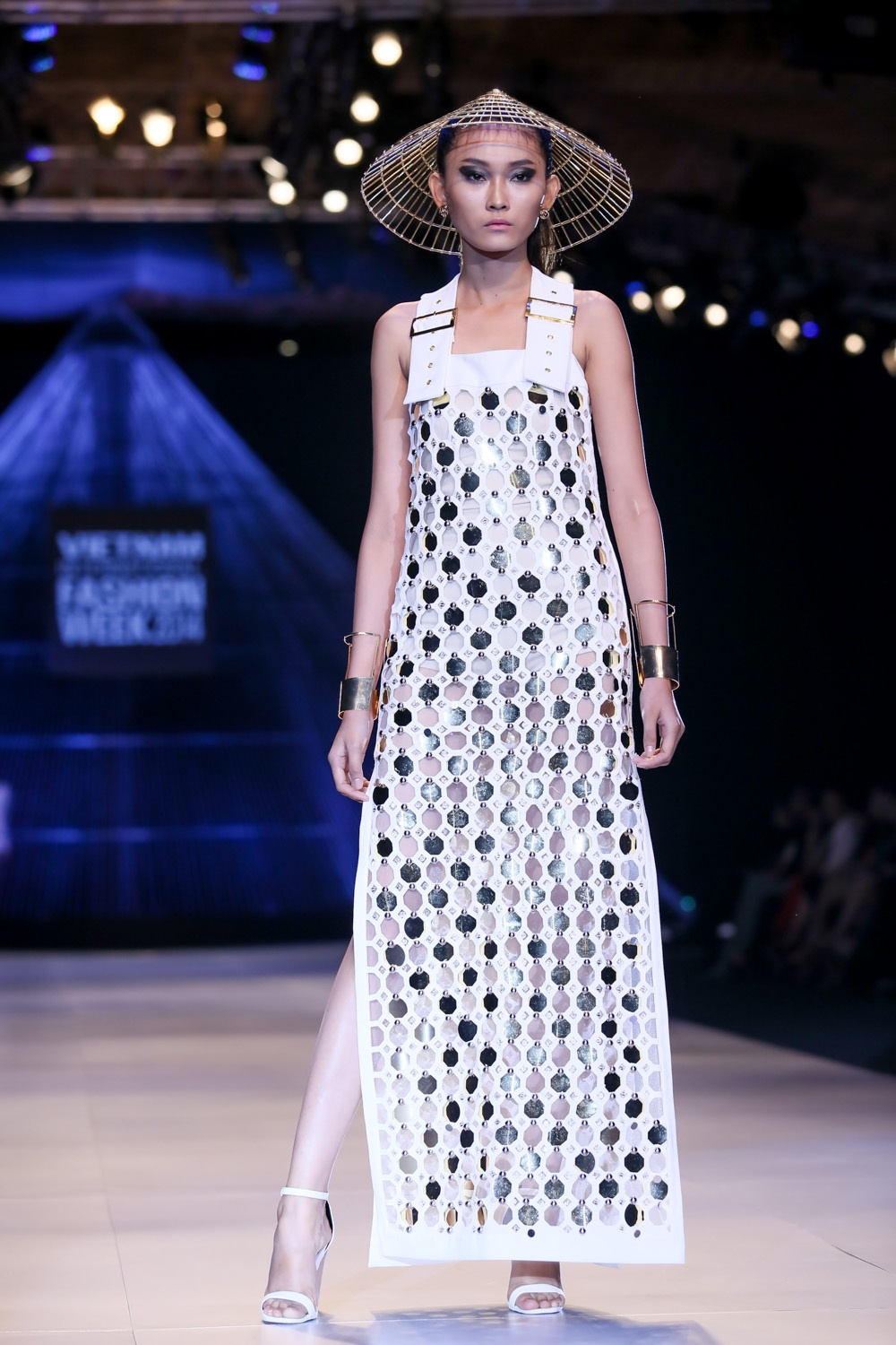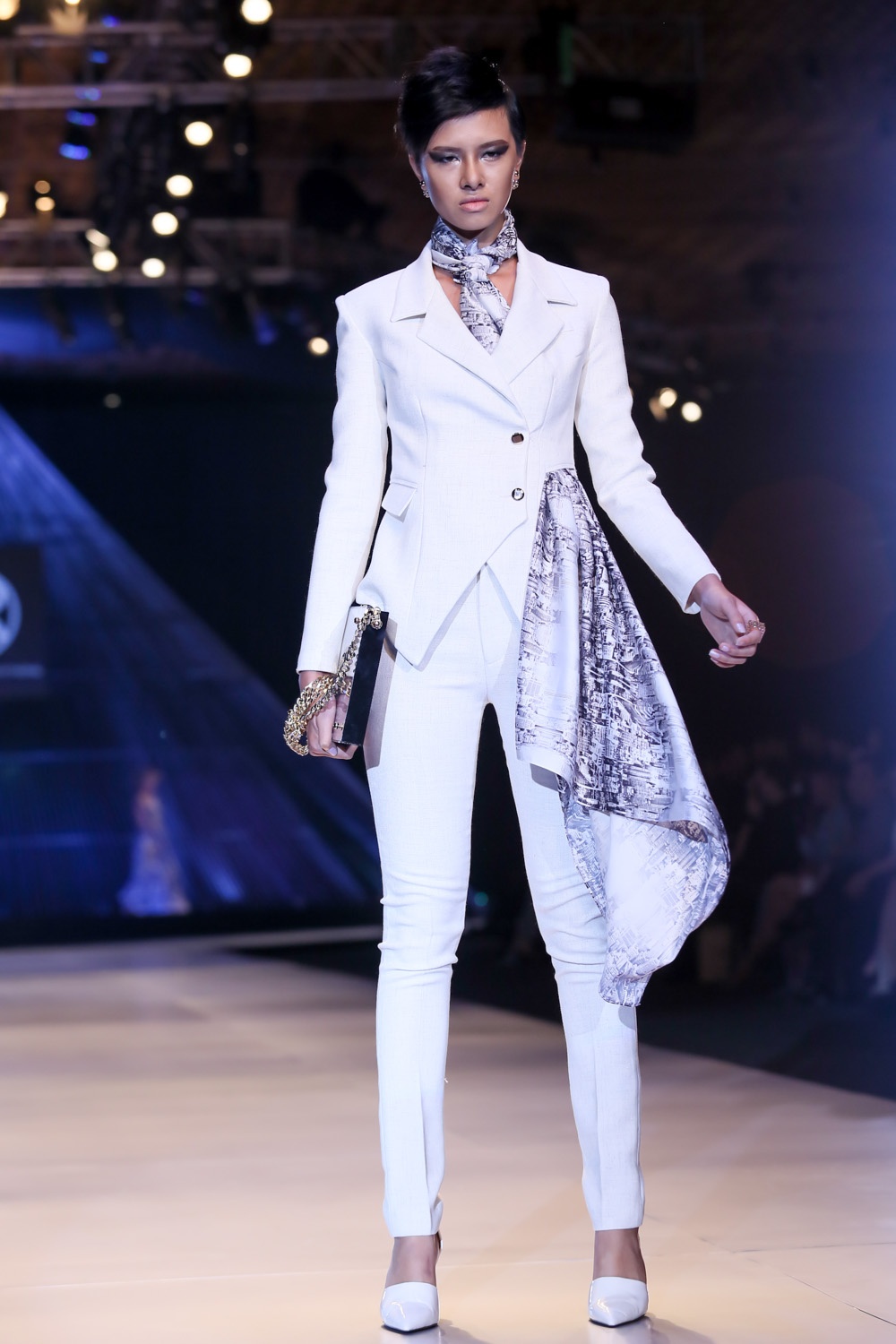 | BST của Chung Thanh Phong lấy tông màu trắng làm chủ đạo, điểm nhấn là họa tiết ánh kim loại bóng sáng. |