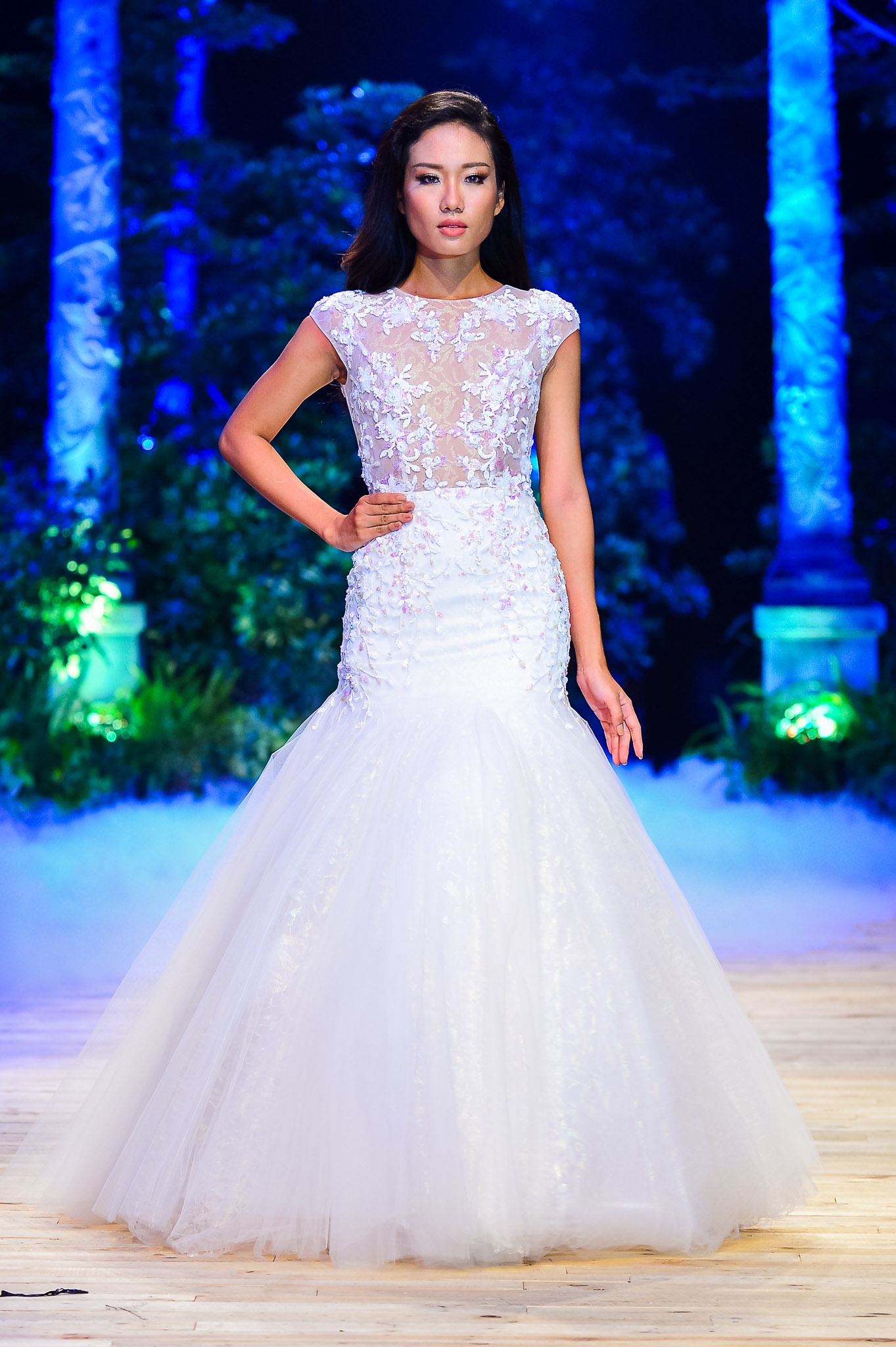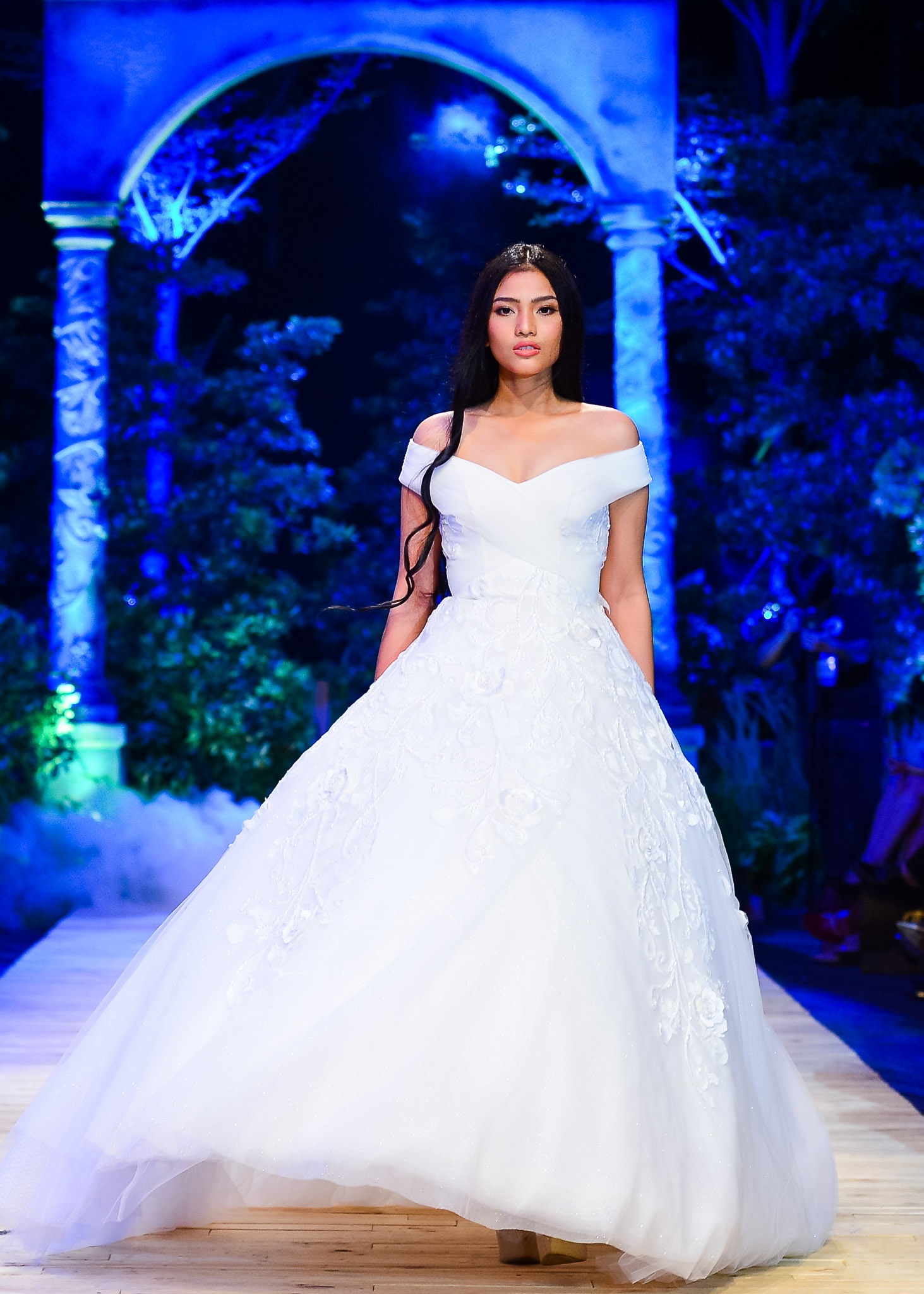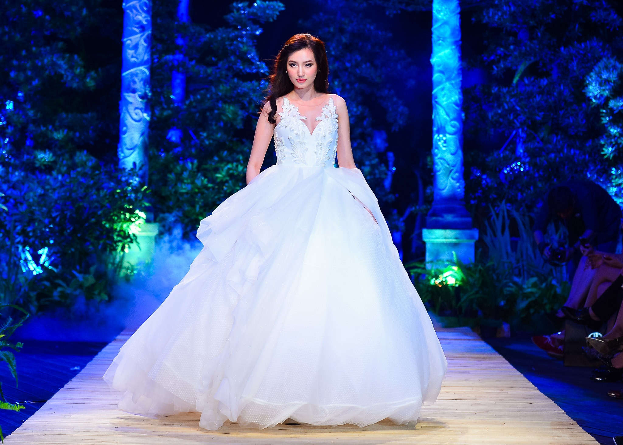 Đảm nhận vai trò vedette bộ sưu tập Thiên thần, nữ người mẫu diện bộ đầm cưới trắng trong trẻo tự tin sải bước, chốt màn show diễn định kỳ.