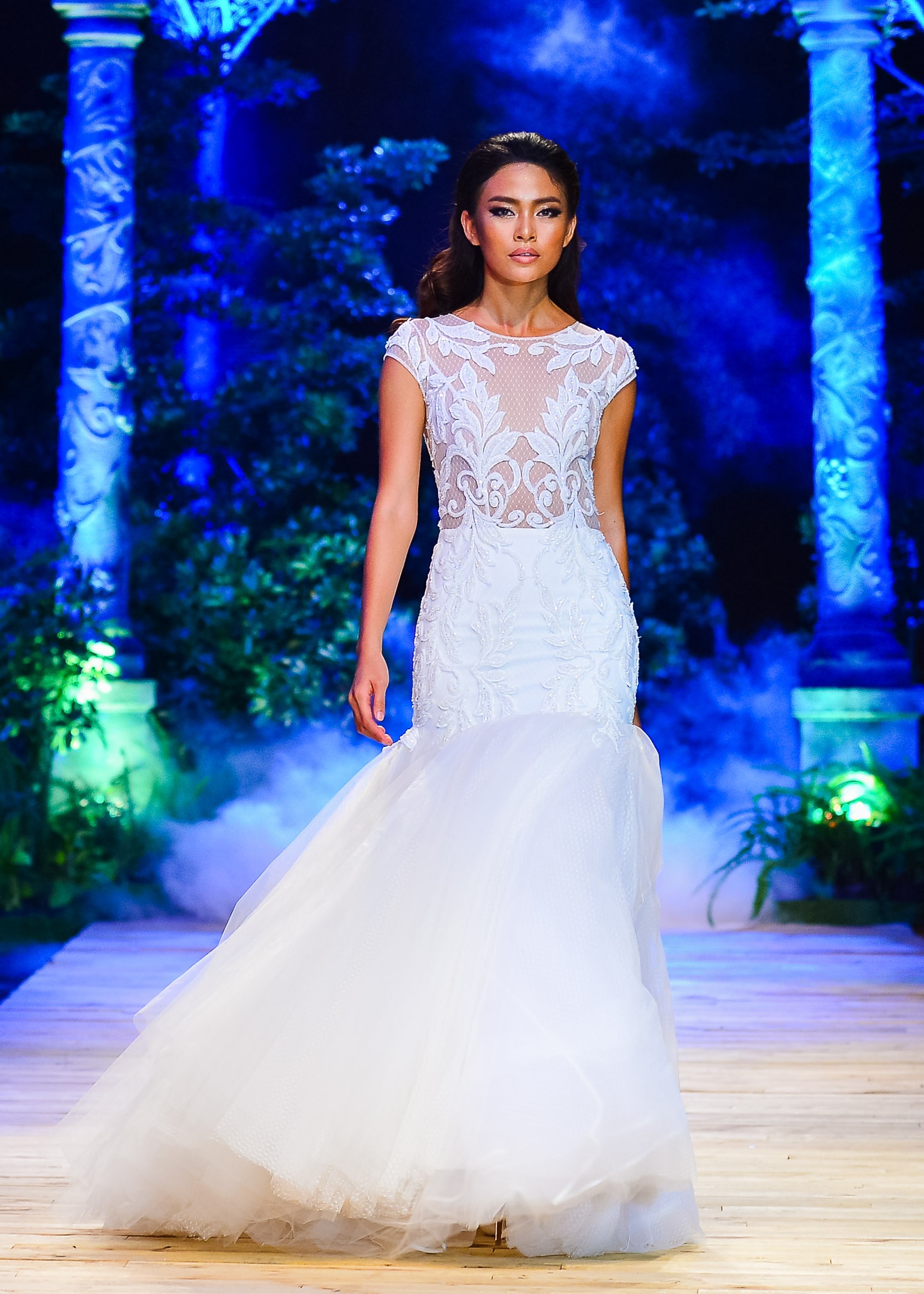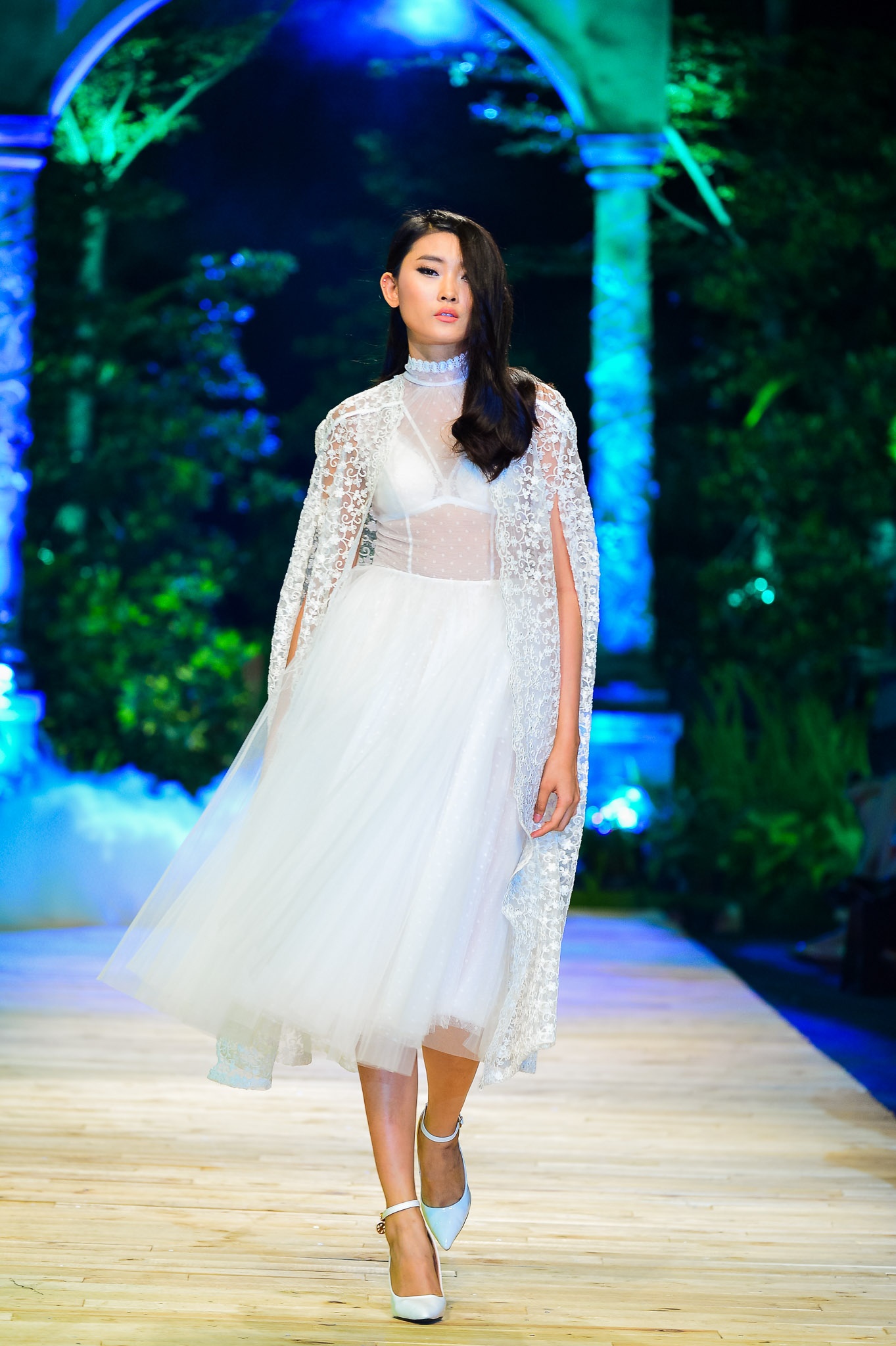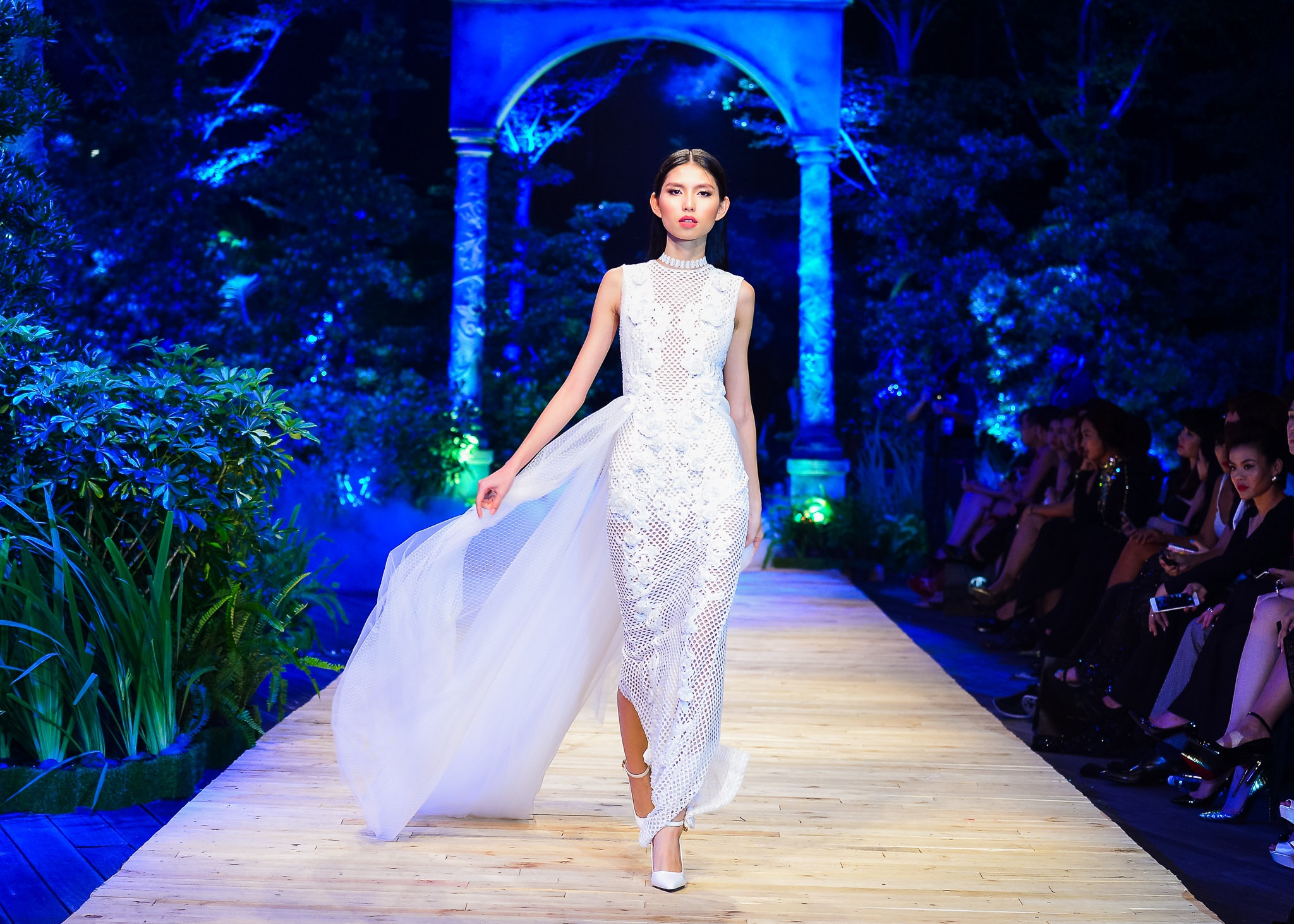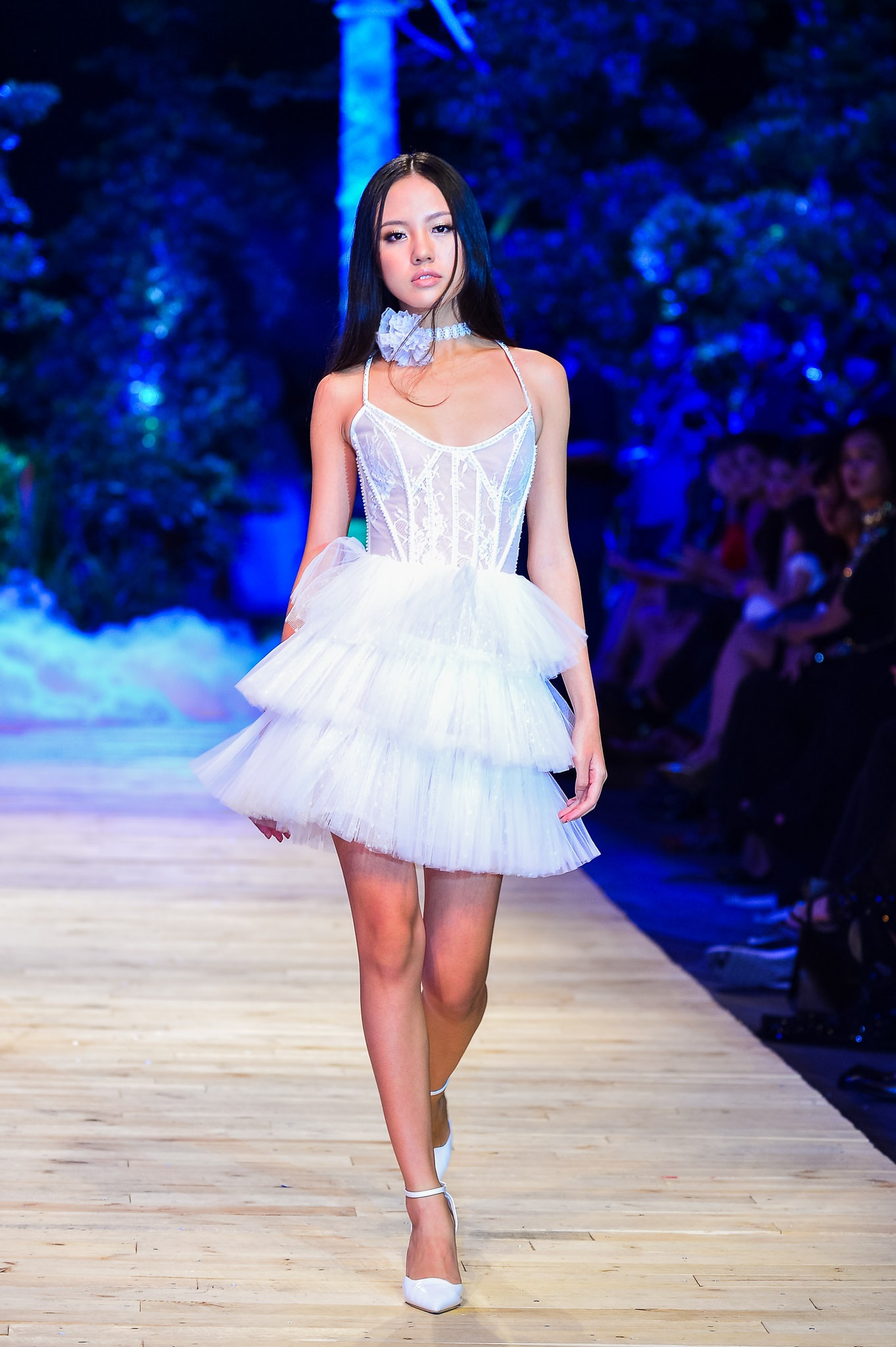 Đảm nhận vai trò vedette bộ sưu tập Thiên thần, nữ người mẫu diện bộ đầm cưới trắng trong trẻo tự tin sải bước, chốt màn show diễn định kỳ.