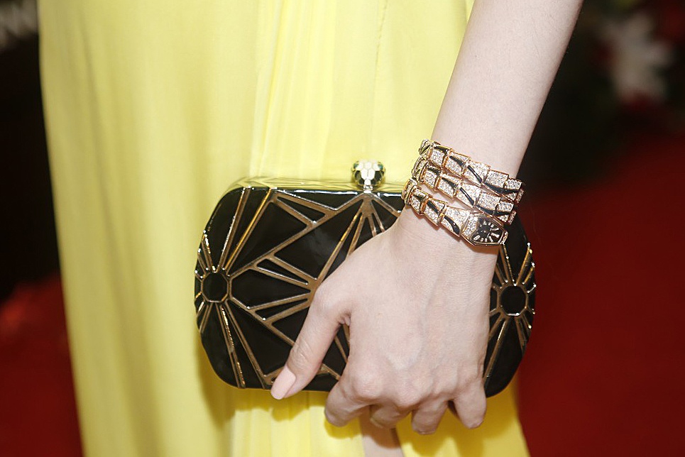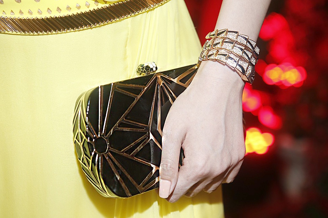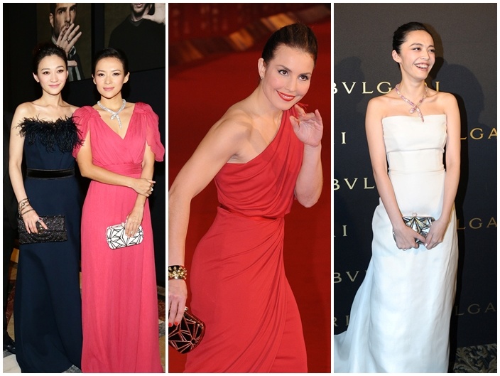| Diễn viên Yao Chen (váy trắng), Noomi Rapace (váy đỏ) và Chương Tử Di (váy hồng) cũng sở hữu kiểu clutch này. |
