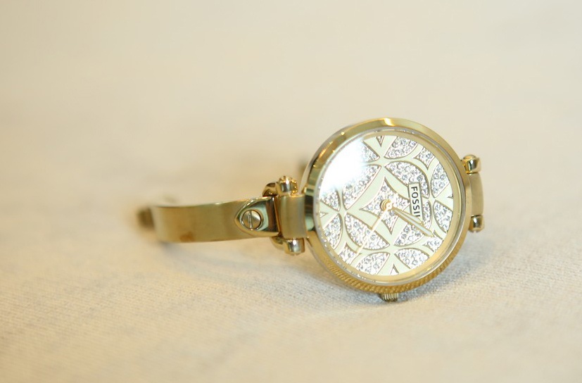 | Đồng hồ Fossil mạ vàng tinh tế, phù hợp với trang phục sang trọng, hiện đại. |