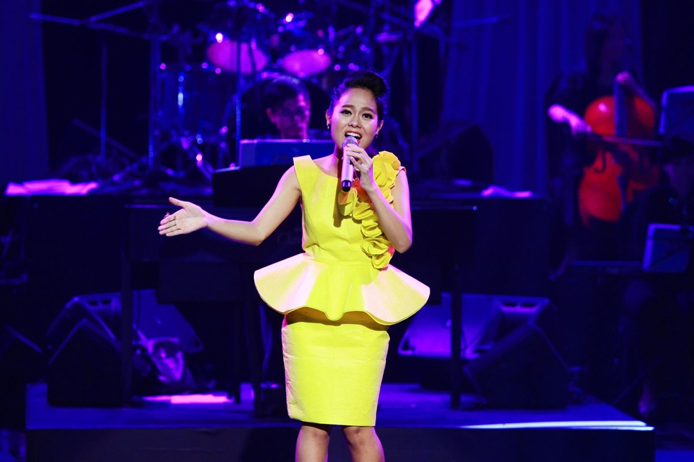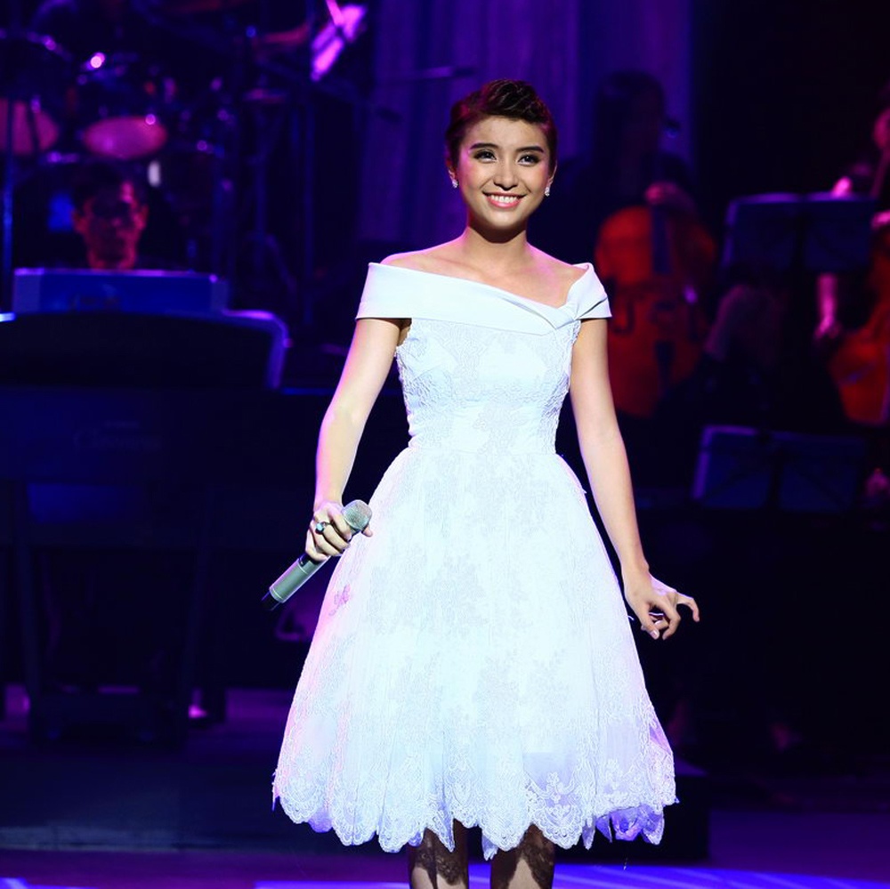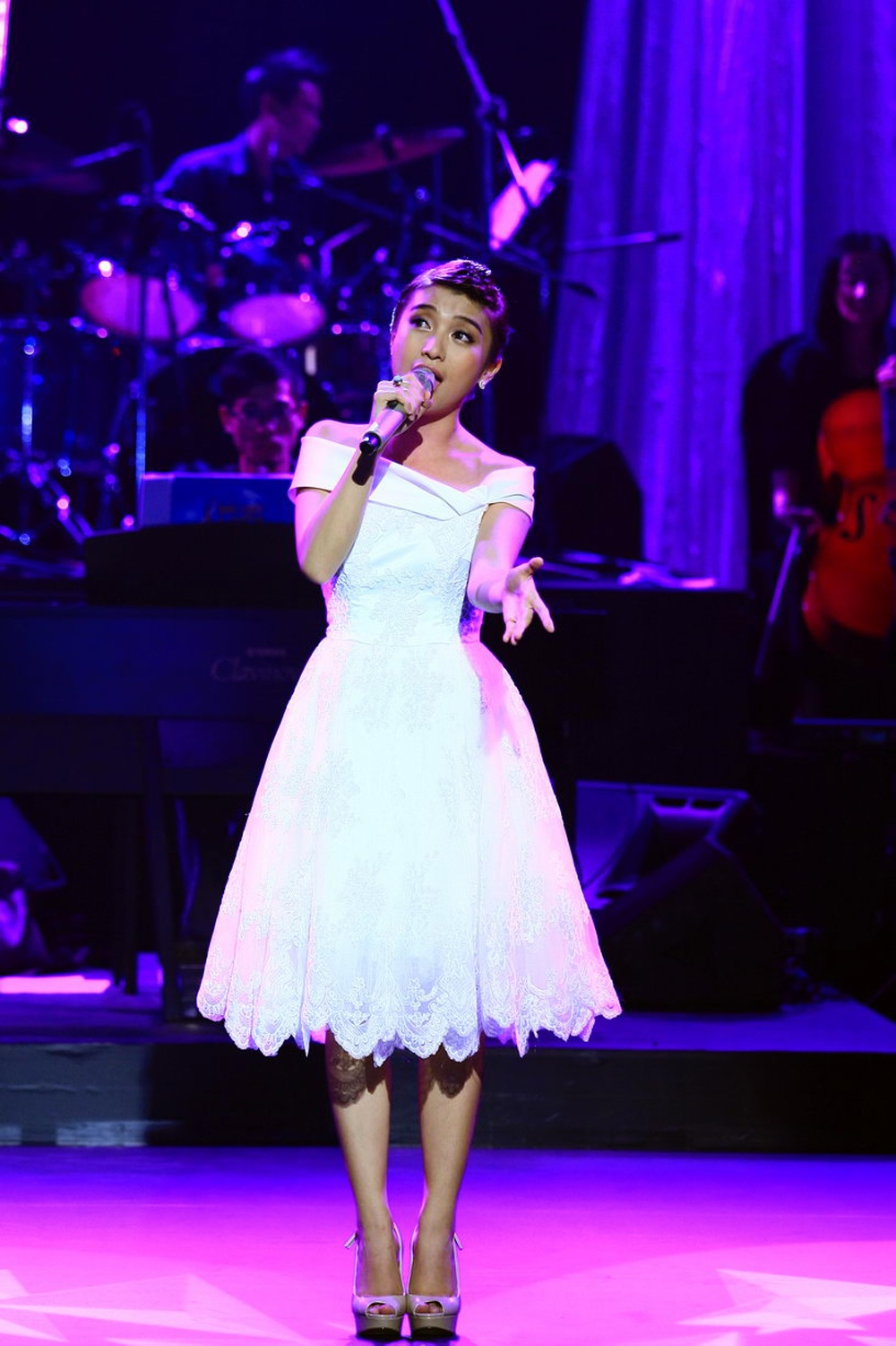 | Nữ ca sĩ trẻ trung và đáng yêu trên sân khấu trong chiếc đầm trắng. |