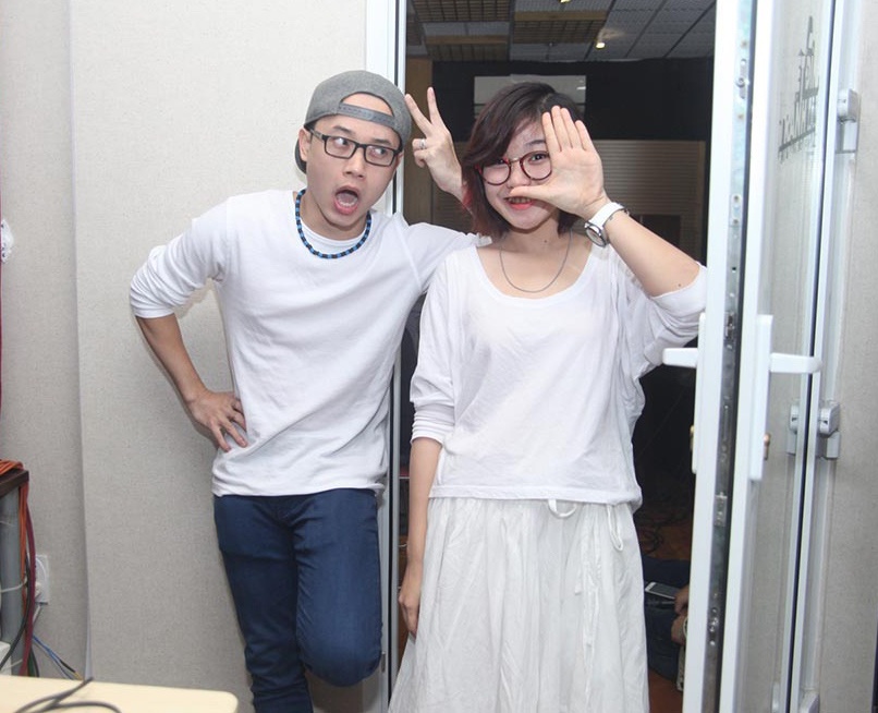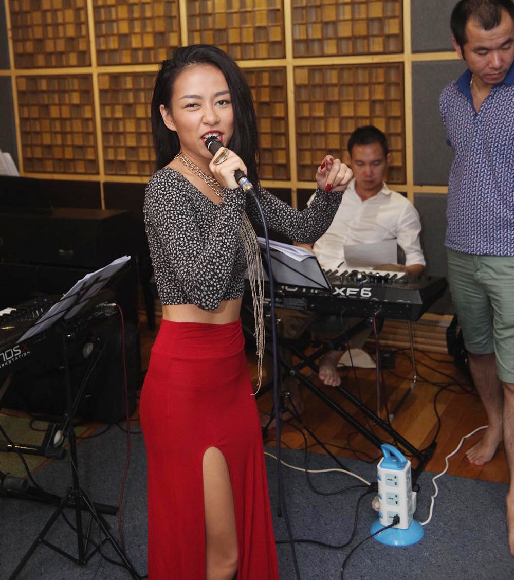 | Để chuẩn bị tốt cho liveshow cuối cùng của Bài hát Việt 2014 diễn ra tối 22/1 dàn ca sĩ có mặt tại phòng thu Viết Tân để tập luyện với ban nhạc Hoài Sa và nhóm bè. Trúc Nhân vẫn vui vẻ, tươi tắn mặc những ồn ào quanh phát ngôn về huấn luyện viên Thu Minh. |