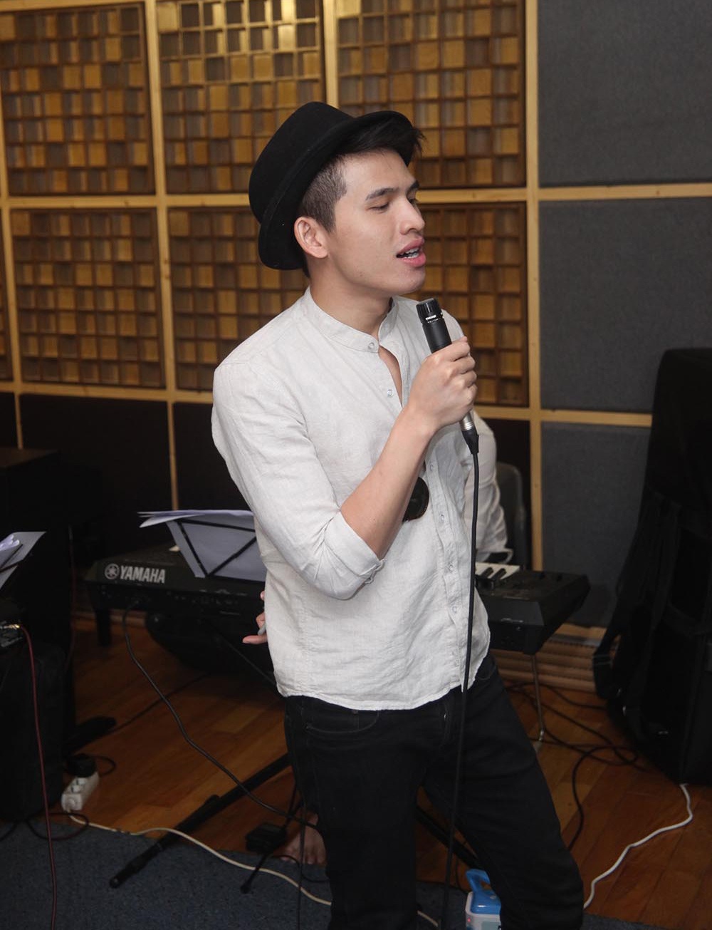 | Có mặt ở phòng thu từ rất sớm, Đinh Mạnh Ninh tranh thủ xem lại lời bài hát trước khi tập luyện với ban nhạc. Trong đêm chung kết, nam ca sĩ Hà thành sẽ thể hiện ca khúc Mùa đông do chính mình sáng tác. |