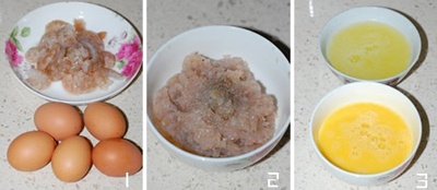 | Băm nhuyễn tôm rồi trộn đều cùng một chút xíu gia vị. Sau đó, tách riêng lòng đỏ và lòng trắng trứng rồi đánh tan. |