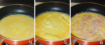 | Làm nóng một cái chảo lớn cùng một chút dầu ăn. Sau đó, láng trứng vào đều chảo, đợi khoảng 30 giây thì dàn đều tôm lên bề mặt trứng. |