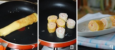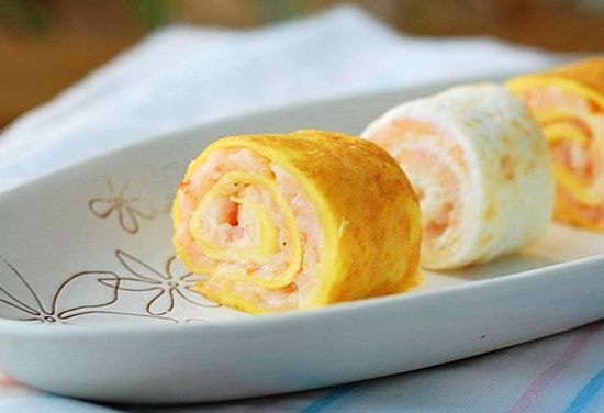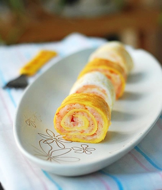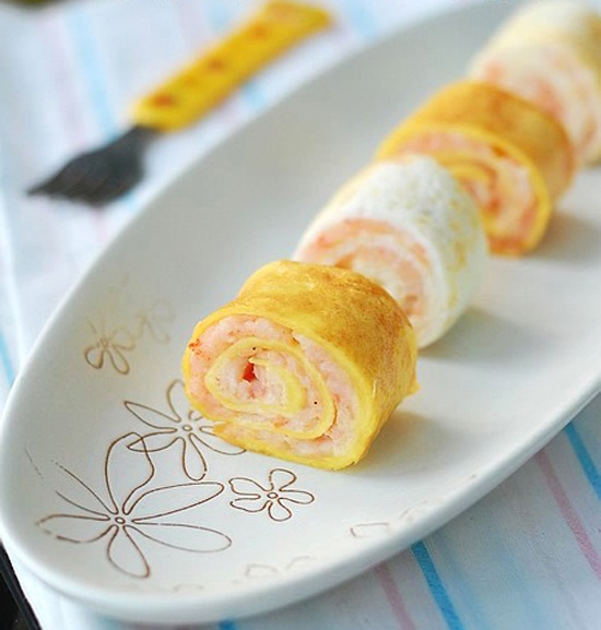 | Nhanh tay cuộn trứng lại. Cắt trứng thành từng khúc rồi rán vàng lại 2 mặt cắt để tôm được chín. |