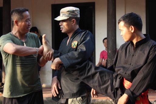| Võ sư Bùi Đăng Văn hướng dẫn diễn viên chính Trung Hiếu một động tác quyền. |
