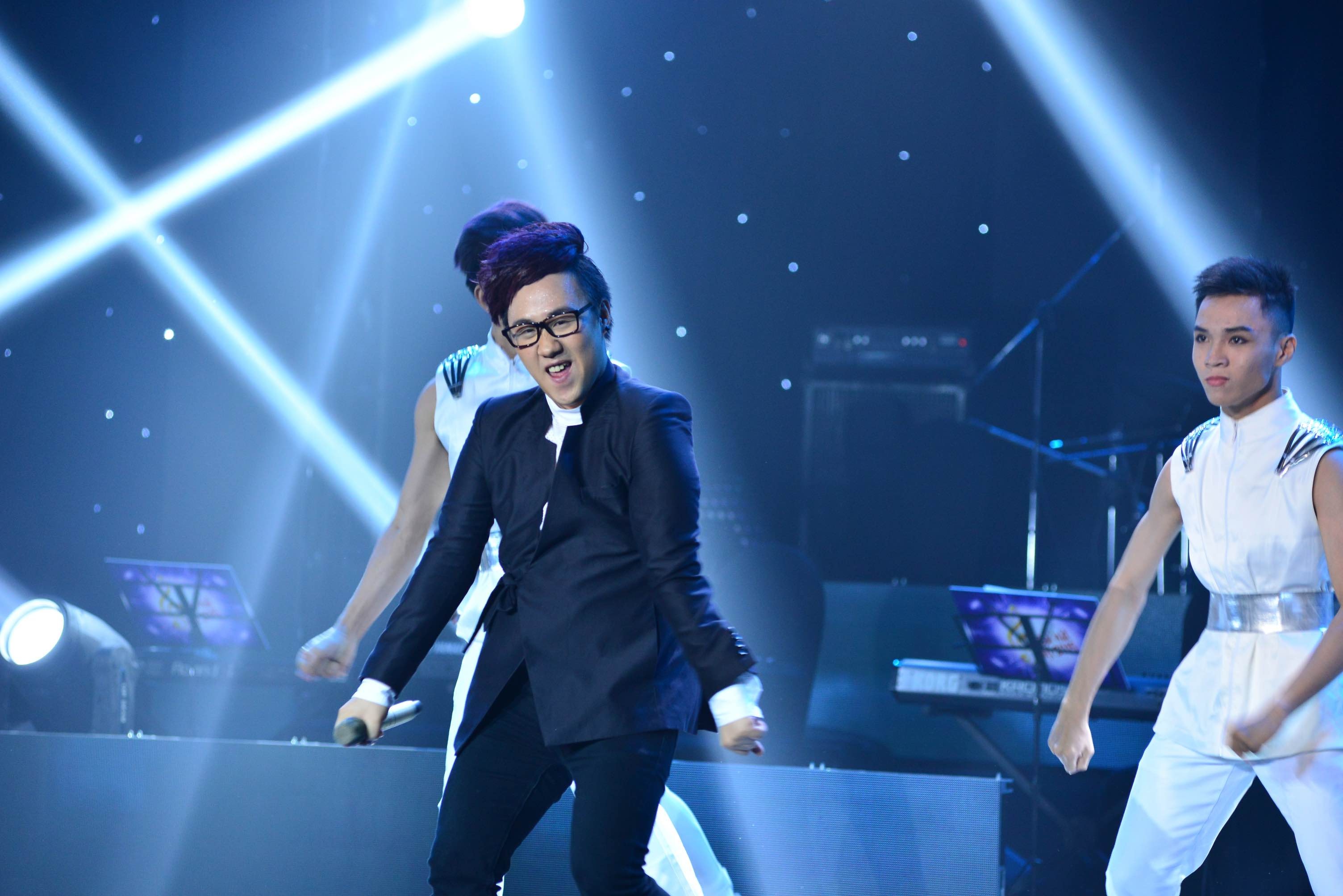 | Trung Quân Idol gây bất ngờ khi vừa hát, vừa nhảy trên sân khấu Bài hát Việt tháng 10/2015. |