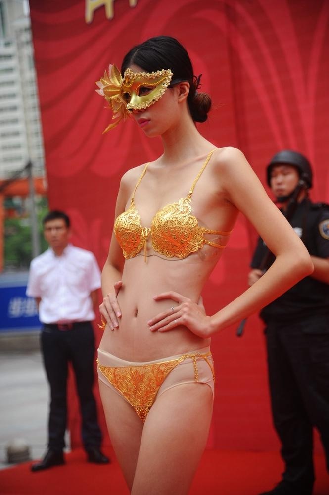 | Cận cảnh một bộ nội y vàng khá tinh xảo. Trình diễn thời trang nội y vàng là một hoạt động không còn quá xa lạ với người dân Trung Quốc, xảy ra gần như thường niên. |