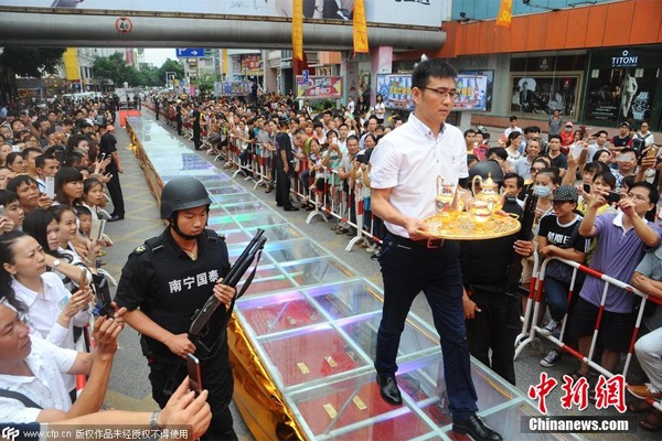 | Ngày 26/9, một cửa hàng vàng ở Quảng Tây (Trung Quốc) gây chú ý khi tạo sàn catwalk và màn trình diễn nội y vàng ngay giữa phố. |