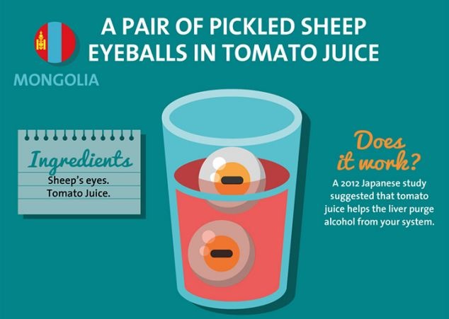 Theo Dailymail, sau một đêm uống rượu, người Mông Cổ thường tống khứ những cảm giác khó chịu bằng một loại cocktail làm từ nước ép cà chua và… mắt cừu. Theo một nghiên cứu của Nhật Bản năm 2012 cho thấy nước cà chua giúp thanh lọc rượu còn sót lại trong hệ thống gan của bạn.