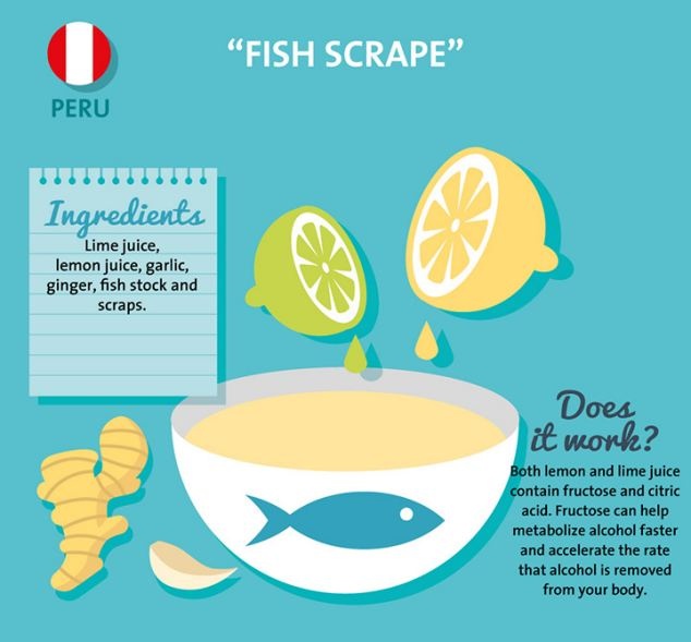 Món ăn được ưa chuộng của người Peru để giải rượu là một sự kết hợp của nước cá, bã cá, nước chanh, tỏi và gừng. Nước chanh có chứa fructose và axid citric, có tác dụng chuyển hóa rượu nhanh hơn và đẩy nhanh độc tố do rượu gây ra ra khỏi cơ thể.