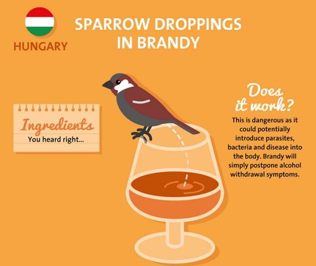 Phương pháp giải rượu này của người Hungary thực tế không có cơ sở và rất nguy hiểm vì nó mang nhiều ký sinh trùng, vi khuẩn và các bệnh vào cơ thể qua phân chim.
