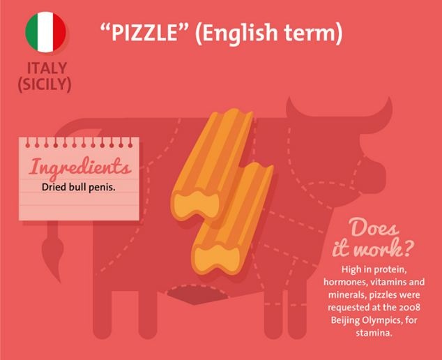 Tại Sicily ở Italia, người dân ở đây sử dụng dương vật bò khô như một biện pháp giải rượu hữu hiệu. Chưa biết nó có hiệu quả chữa chứng nôn nao hay không, nhưng do có chứa hàm lượng protein, hormone, vitamin và khoáng chất cao, nên dương vật bò khô đã từng được sử dụng tại Thế vận hội Bắc Kinh năm 2008 để tăng sức chịu đựng cho các vận động viên.