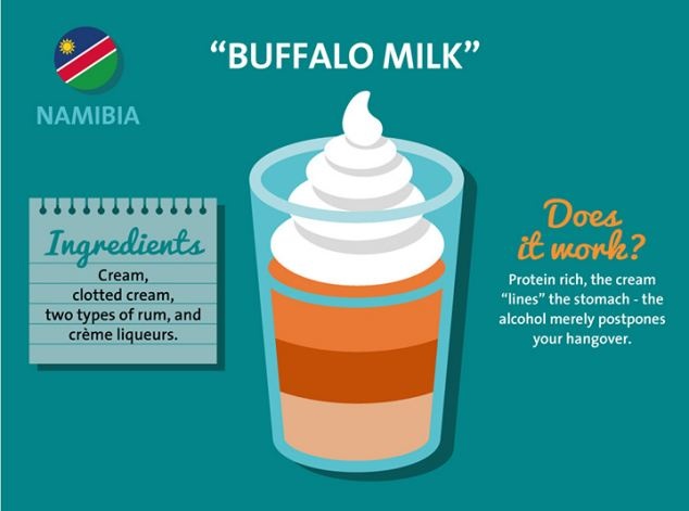 Với sự kết hợp của kem đông (được tạo từ sữa trâu), rượu rum, rượu mùi và các loại kem, một cốc sữa trâu rất giàu protein có khả năng đánh tan các cảm giác khó chịu và nôn nao của bạn sau cơn say. Đây là biện pháp giải rượu được ưa thích của người Namibia.