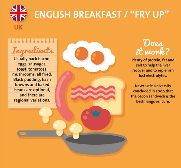 Tất cả các món ăn như xúc xích, thịt xông khói, bánh mì nướng, cà chua, nấm, trứng đều người Anh chiên lên để giải rượu. Biện pháp này sản sinh ra rất nhiều protein, chất béo và muối giúp gan phục hồi và bổ sung chất điện giải đã bị mất sau khi say rượu. Nghiên cứu của ĐH Newscastle năm 2009 cho thấy bánh mì kẹp thịt xông khói là phương pháp chữa bệnh nôn nao tốt nhất.