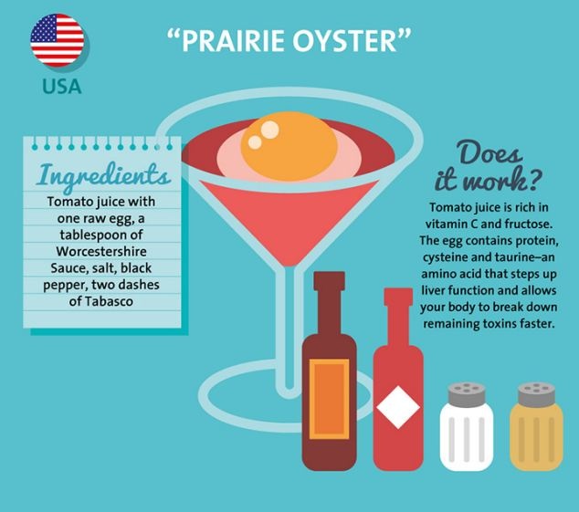 Để giải rượu, người Mỹ thường sử dụng một cốc nước ép cà chua với một lòng đỏ trứng, một muỗng nước sốt Worcestershire, muối, hạt tiêu đen. Loại cocktail này rất có hiệu quả vì nước ép cà chua rất giàu vitamin C và fructose, còn trứng thì chứa protein, cysteine và taurine đều có thể bổ sung dưỡng chất cho gan và giúp cơ thể loại bỏ các độc tố còn lại nhanh hơn.