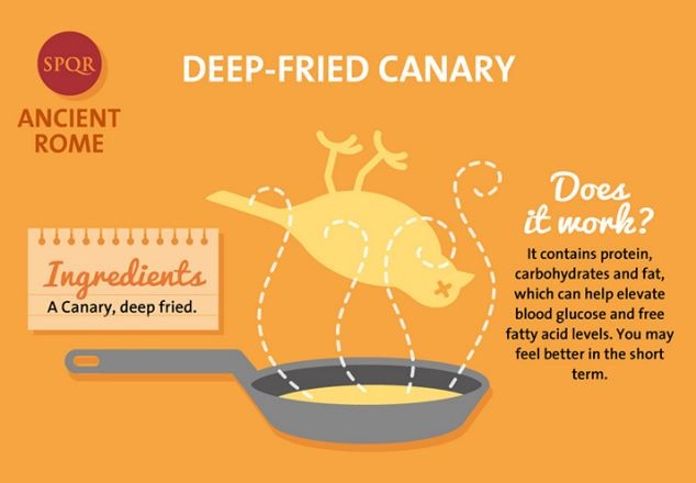 Người La Mã cổ tìm cho mình một cách giải rượu khá độc đáo bằng cách chiên giòn một con chim hoàng yến. Món ăn này rất giàu protein, carbohydrate và chất béo, có thể giúp tăng cao lượng đường trong máu và nồng độ acid béo tự do. Bạn sẽ cảm thấy dễ chịu trong một thời gian ngắn.