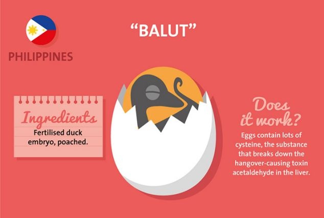 Người Phillipines sử dụng trứng vịt lộn để giải rượu vì trong món ăn này có chứa nhiều cysteine, một loại chất phân hủy các độc tố acetaldehyde gây nôn nao, khó chịu trong gan.