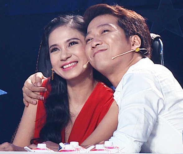 Trường Giang trong vai trò giám khảo khách mời hết lời khen ngợi vẻ ngoài xinh đẹp của Lê Phương. Anh nói đầy ngụ ý: “Phương rất dễ thương và xinh đẹp. Những người nào tên Phương cũng xinh đẹp giống y chang vậy”. Trong ảnh, nam diễn viên hài phấn khích ôm đàn chị Việt Trinh trên ghế nóng. |