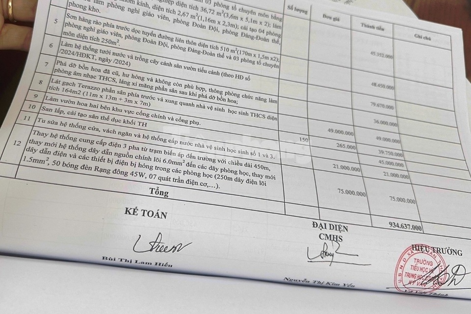 Ngoài ra, trường còn liệt kê chi tiết nhiều hạng mục khác như làm hệ thống tưới nước, trồng cây cảnh (hơn 79 triệu đồng); phá dỡ bồn hoa cũ, hư hỏng, không còn phù hợp (36 triệu đồng); làm vườn hoa hai bên cổng chính và phụ (hơn 39 triệu đồng); san lấp, cải tạo sân thể dục khối tiểu học (45 triệu đồng)…