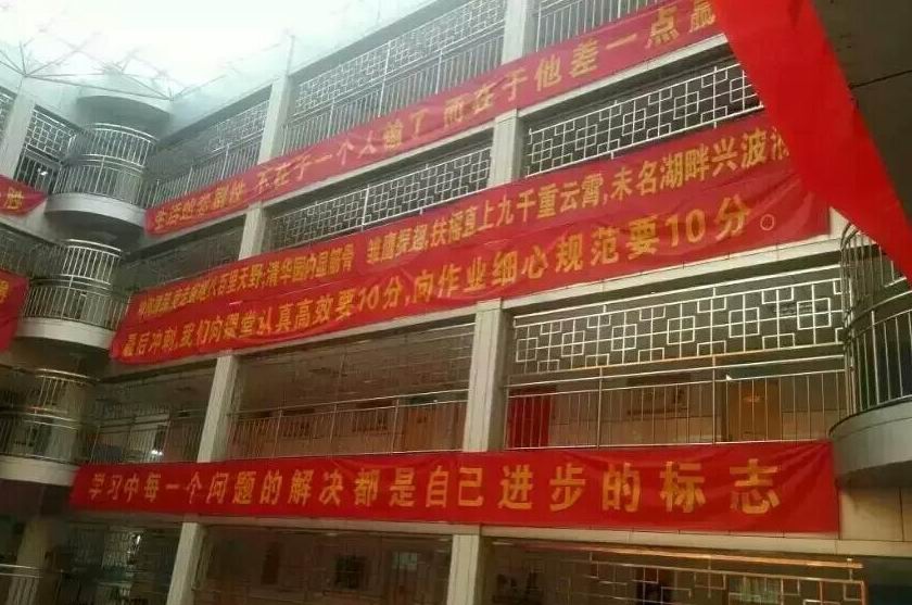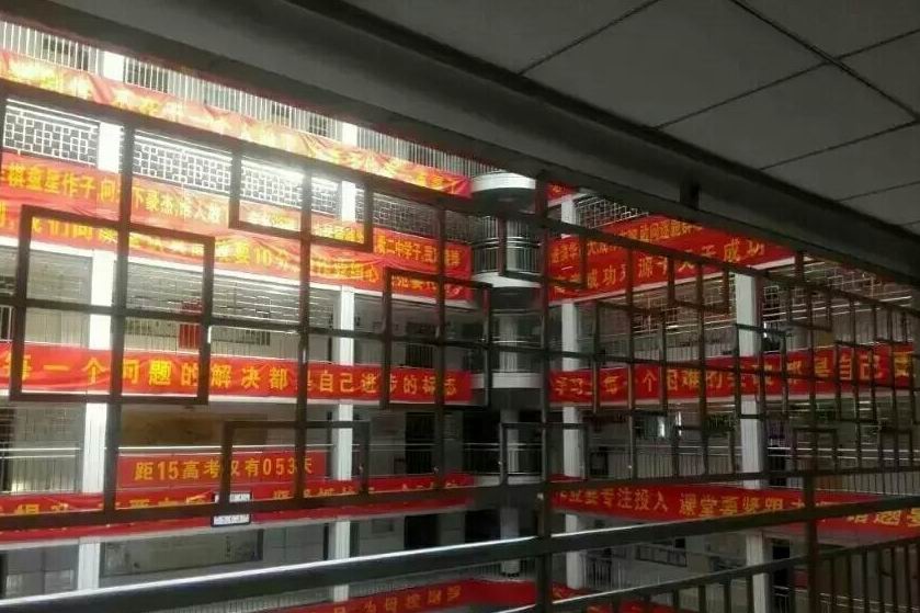Truyền thông Trung Quốc đăng tải những bức ảnh về trường trung học ở thành phố Hoành Thủy, tỉnh Hà Bắc. Tất cả các hàng lang đều được gắn rào sắt. Bên ngoài những khẩu hiệu, biểu ngữ giăng kín để cổ vũ tinh thần học sinh. |