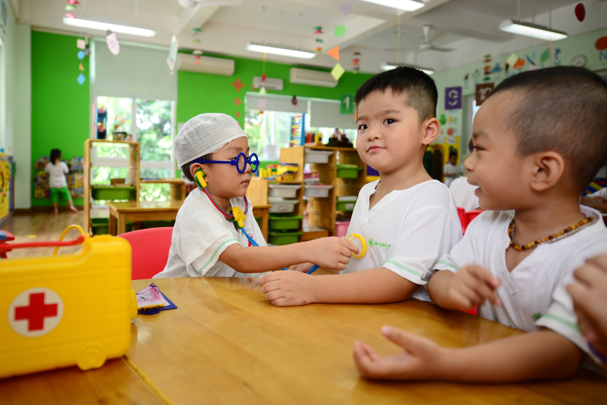 | Dạy trẻ theo phương pháp Montessori, các cô giáo luôn tạo điều kiện để học sinh tự lập. Trong ảnh: Bé lớp 4-5 tuổi tập làm bác sĩ. |
