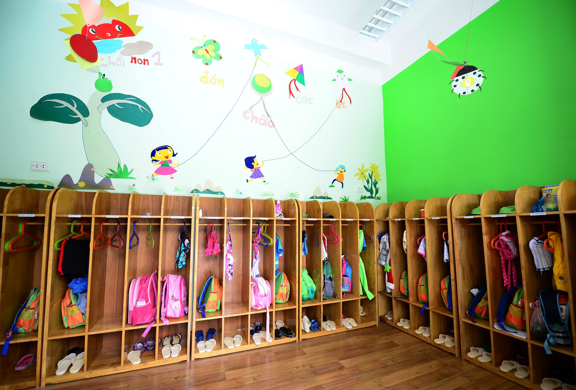 | Mỗi bạn nhỏ sẽ có một ô riêng để sắp xếp giầy, dép, túi xách, quần áo của mình. |
