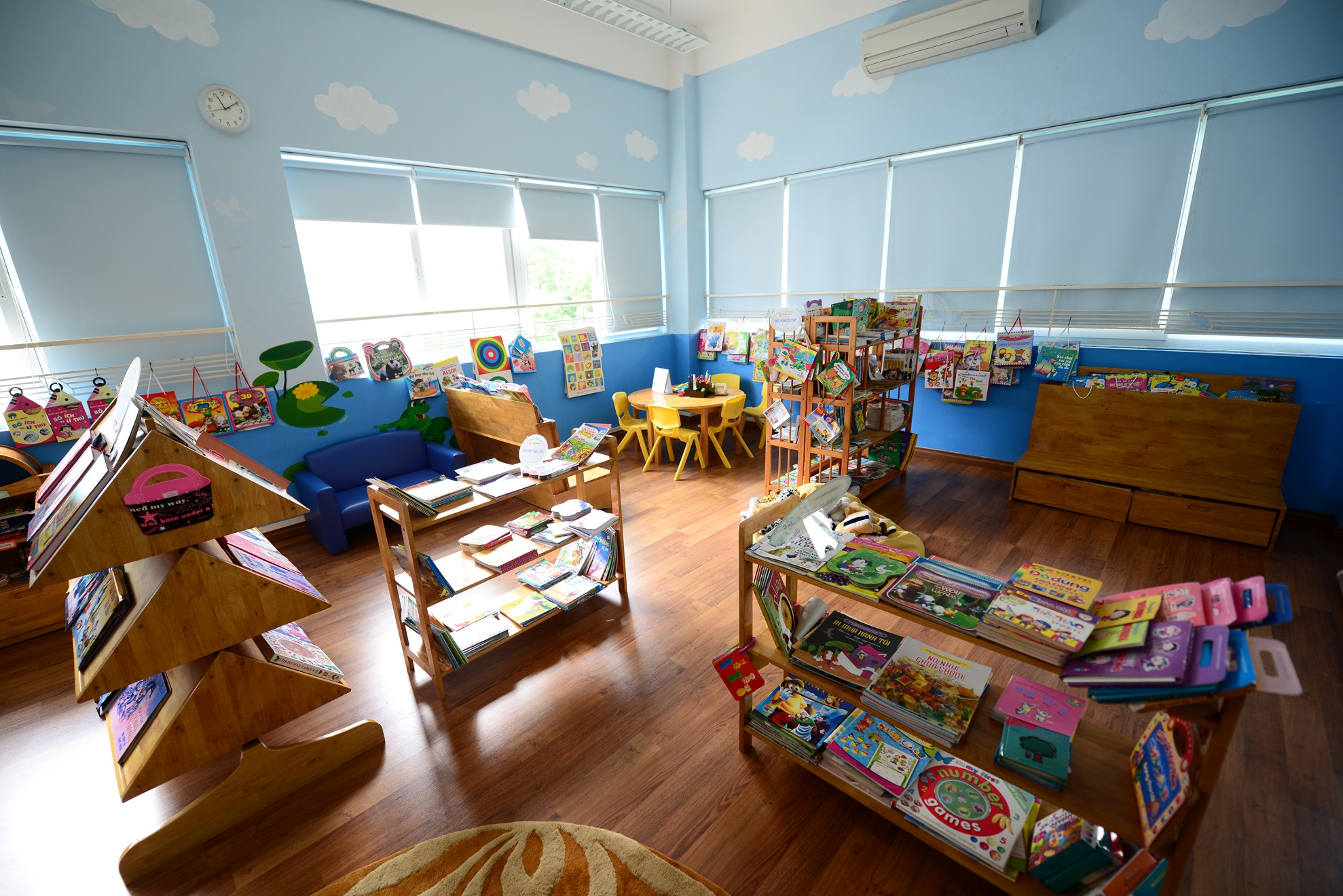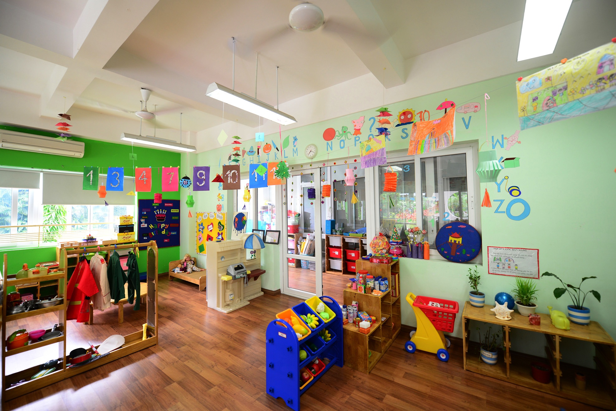 Phòng học thiết kế thành từng góc nhỏ với các chủ đề khác nhau giúp trẻ vừa học vừa chơi.