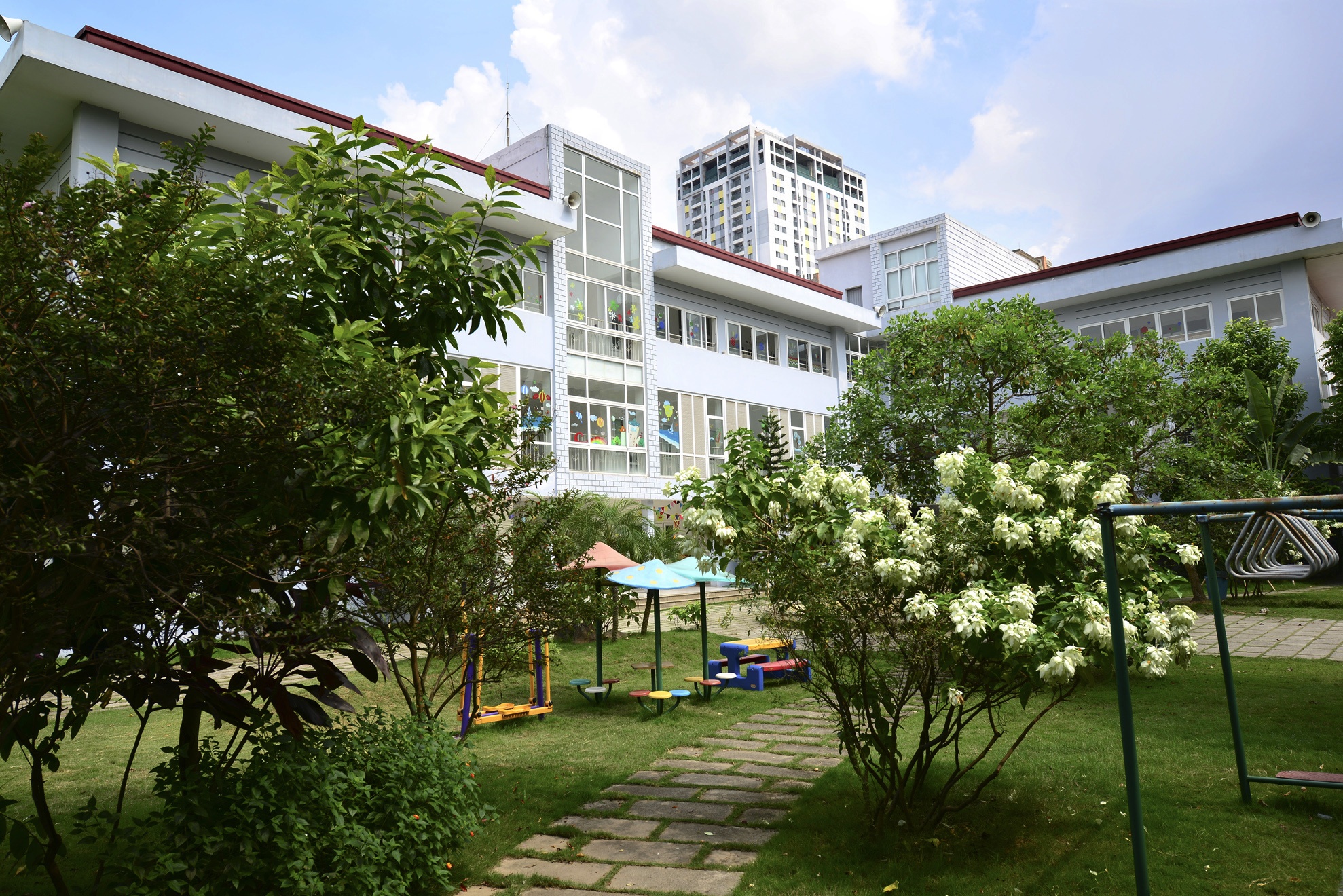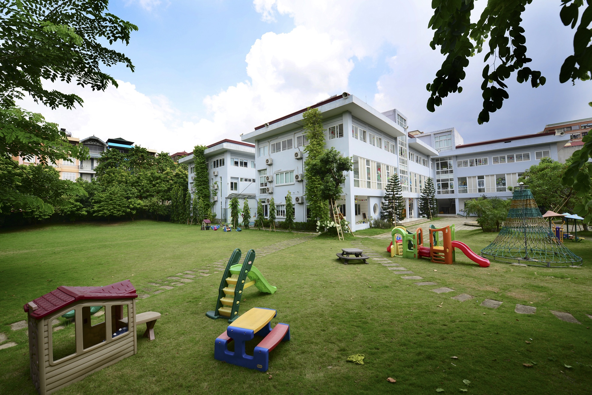 Đây là một trong những trường mầm non lớn nhất Hà Nội được xây dựng trên khuôn viên hơn 5.000 m2, trong đó điểm nhấn là không gian xanh hơn 3.000 m2 sân cỏ, đồi, vườn hoa, bể bơi.