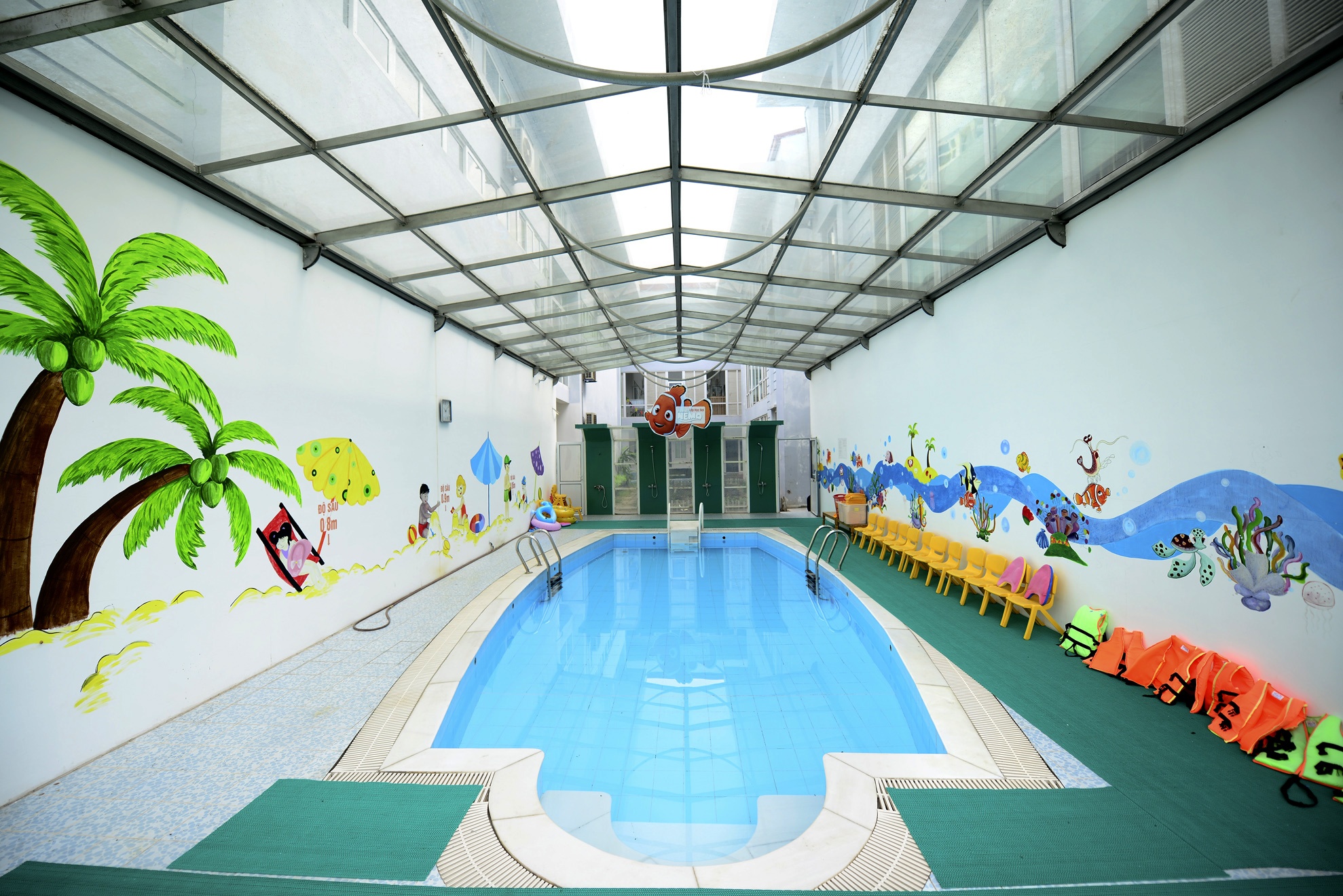 Bể bơi nằm ngay trong khuôn viên của trường, được xây kín đảm bảo an toàn cho trẻ.