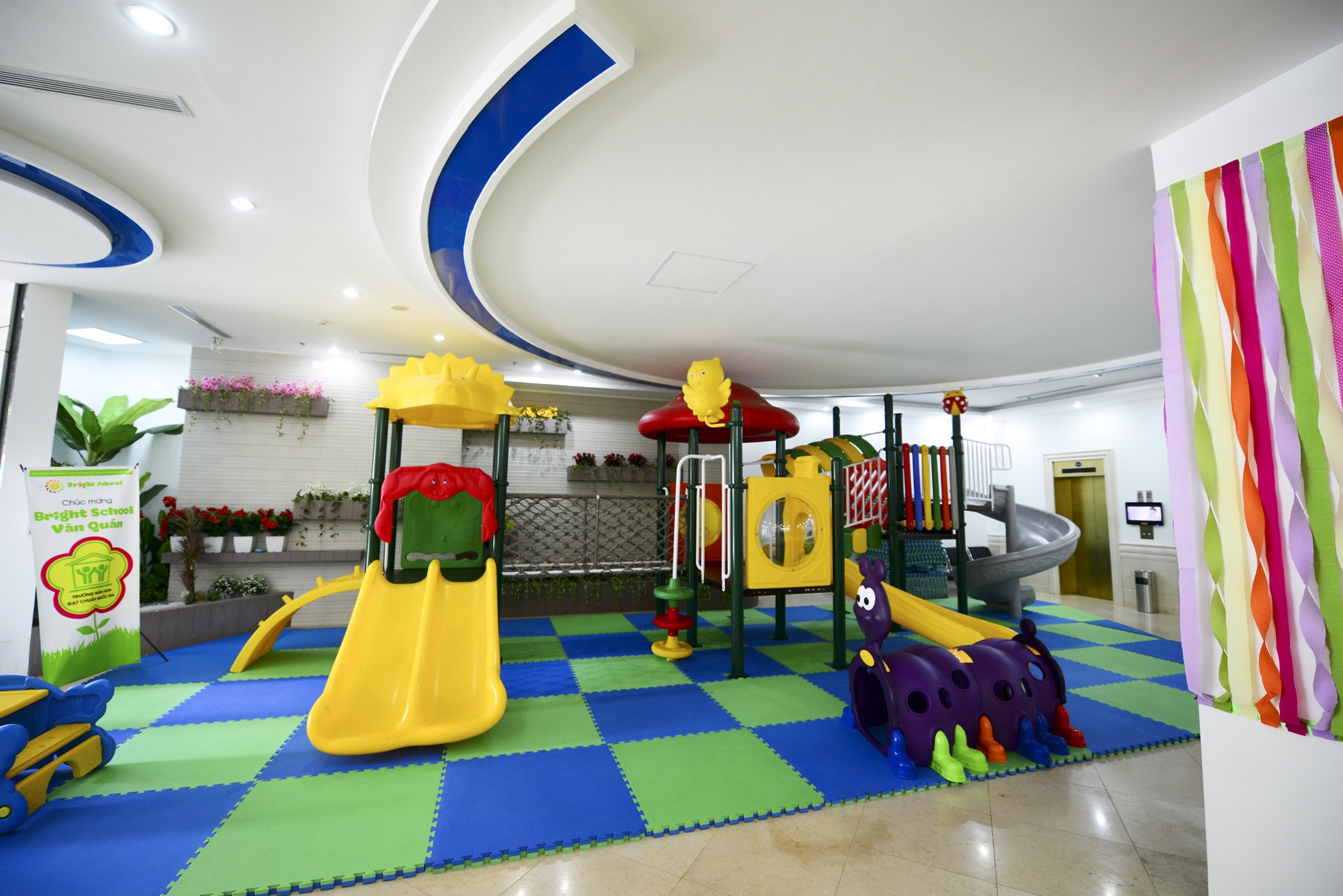 Ngoài ra, trường còn vừa xây dựng cơ sở 2 nằm trên phố Trần Hưng Đạo. Mặc dù là địa điểm trung tâm thành phố, nhưng trường vẫn đảm bảo đầy đủ cơ sở vật chất theo chuẩn quốc gia với diện tích sử dụng đất bình quân tối thiểu 8m2 cho một trẻ. Trong ảnh: Khu vui chơi trong nhà nằm ở tầng một.