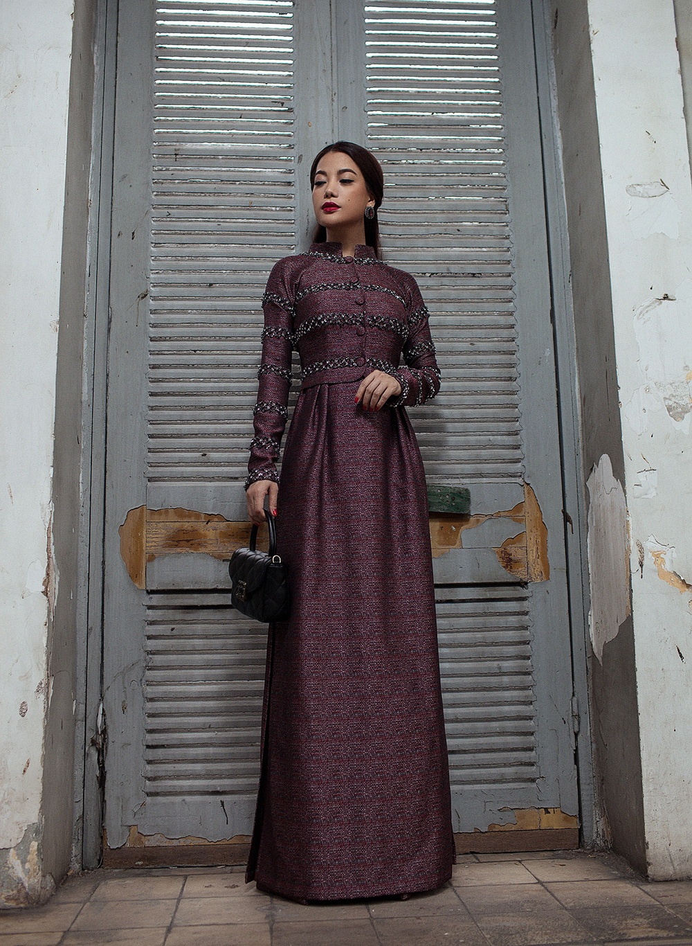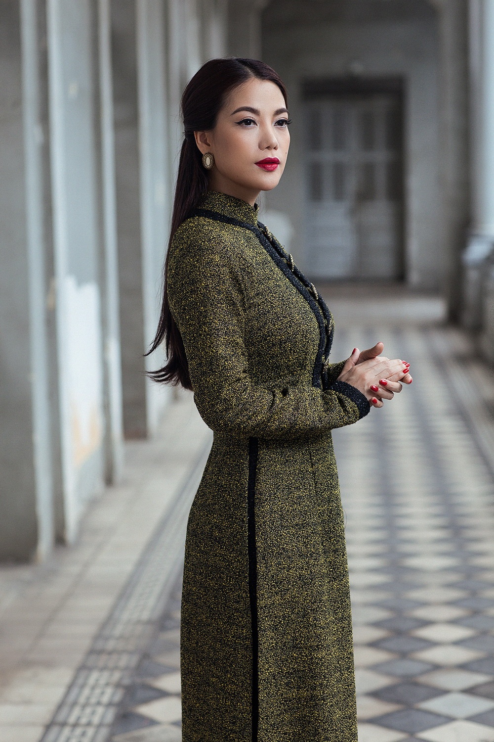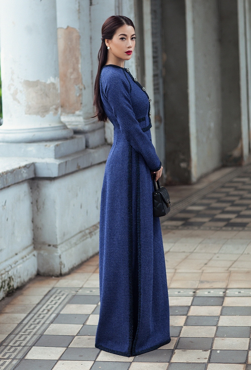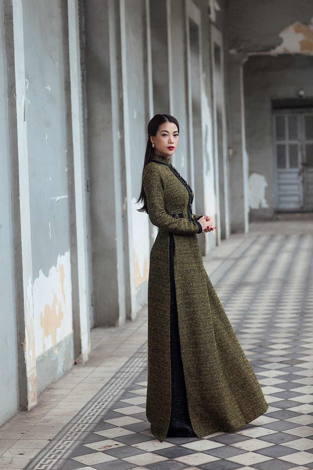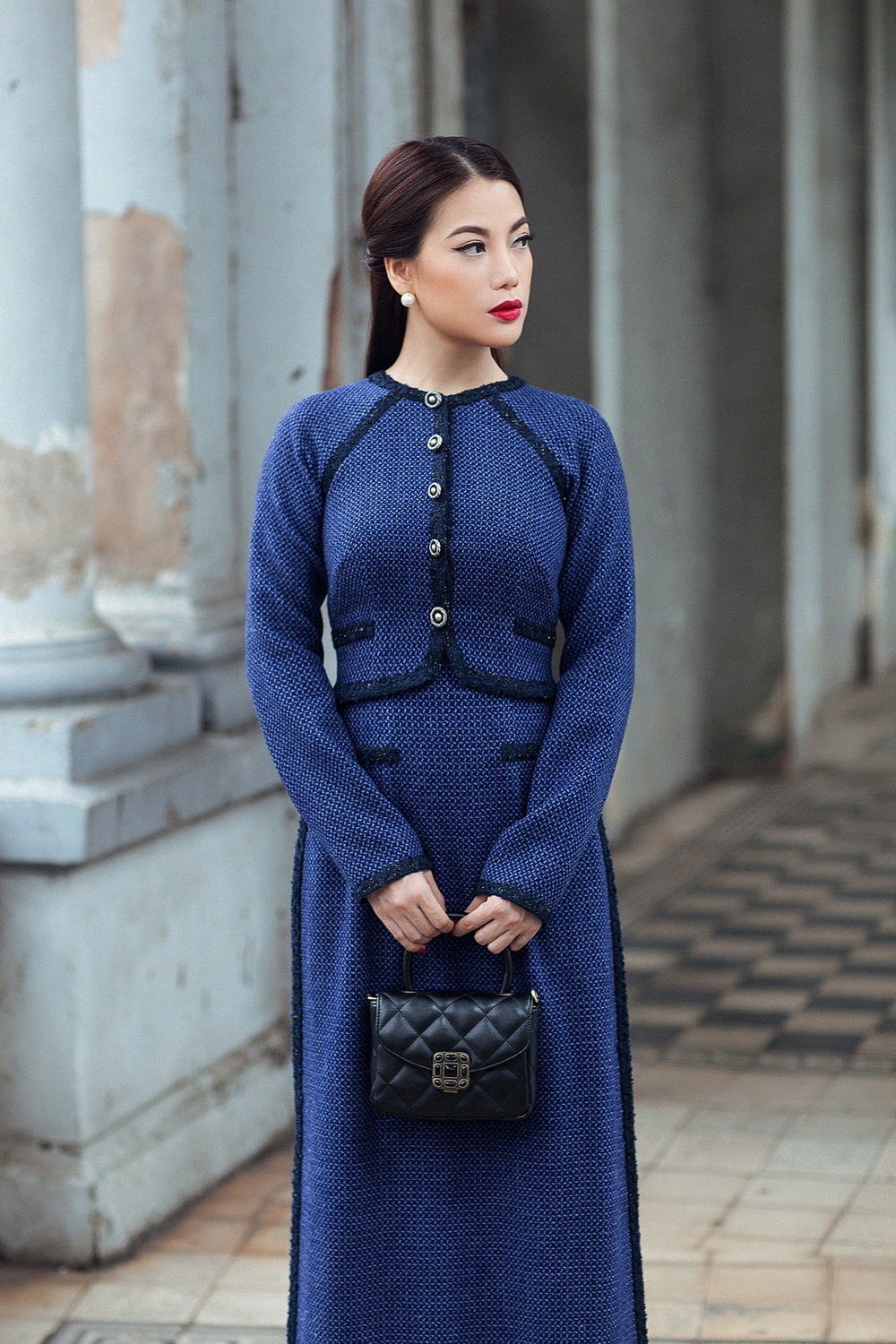 | Chất liệu vải tweed tưởng chừng nặng nề nhưng lại làm vững chắc cấu trúc áo dài, giúp tà áo phẳng phiu trang nhã. |