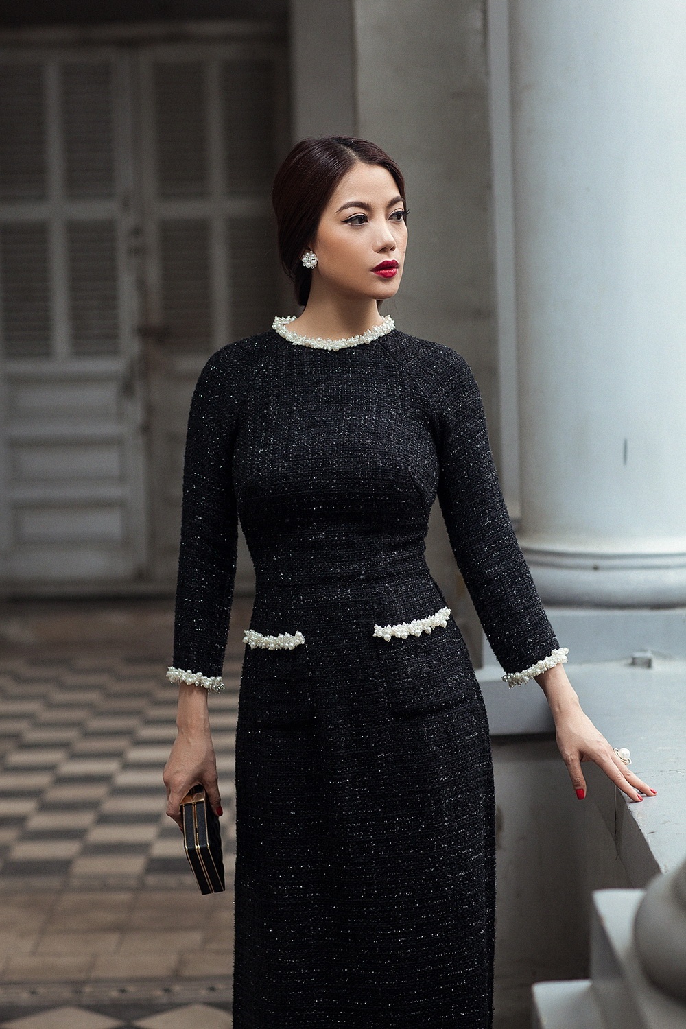 Áo dài vải tweed kết hợp áo khoác cổ điển mang đến vẻ sang trọng, thanh lịch cho nữ diễn viên "Hương Ga".