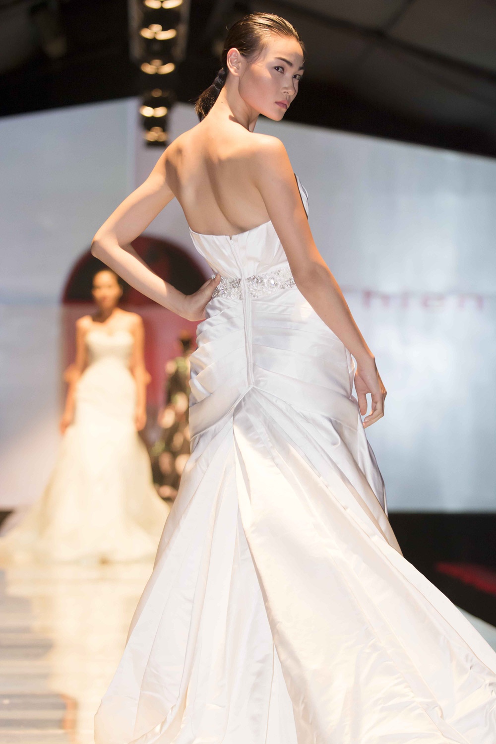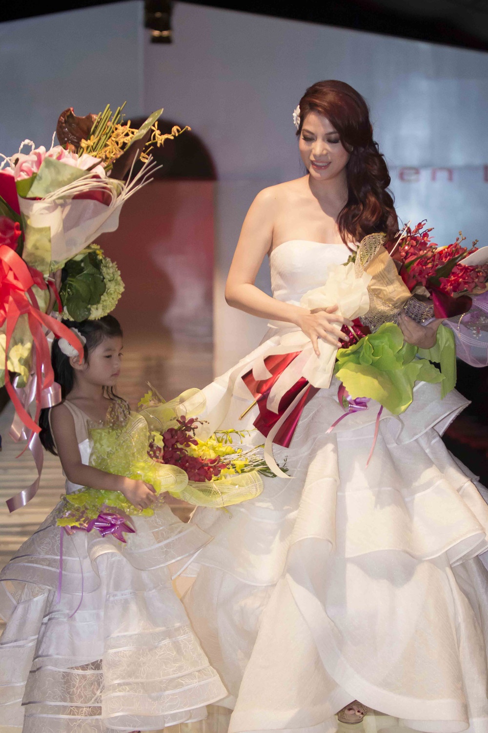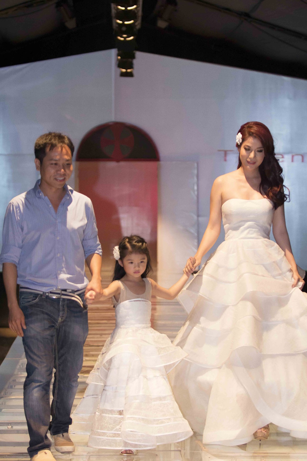 | Trương Ngọc Ánh và bé Bảo Tiên bất ngờ tiến ra sân khấu trong bóng tối, khi tiếng nhạc cất lên và ánh đèn bừng sáng trên sàn catwalk. Tuy mới 4 tuổi nhưng bé Bảo Tiên đã sải những bước chân chuyên nghiệp như người mẫu thực thụ, trình diễn tự tin cùng mẹ. |
