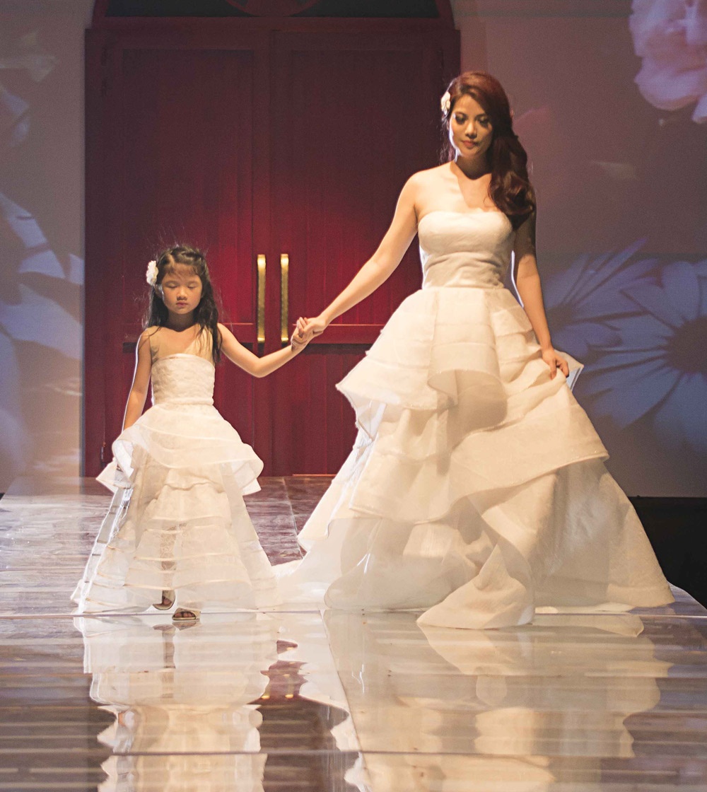 Hai mẹ con mặc hai chiếc đầm trắng có đính đá quý tinh xảo, nằm trong dòng haute couture của nhà thiết kế này.