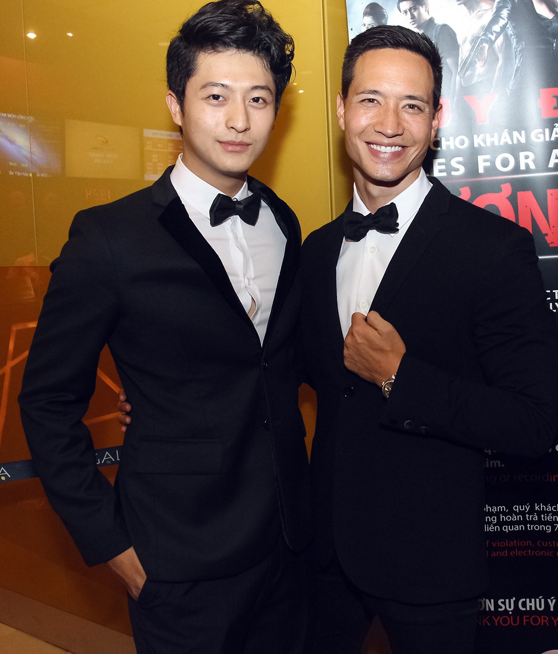 Harry Lu đọ vẻ đẹp trai, phong độ cùng Kim Lý. Cả hai đều diện vest đen lịch lãm đến giao lưu cùng người hâm mộ.