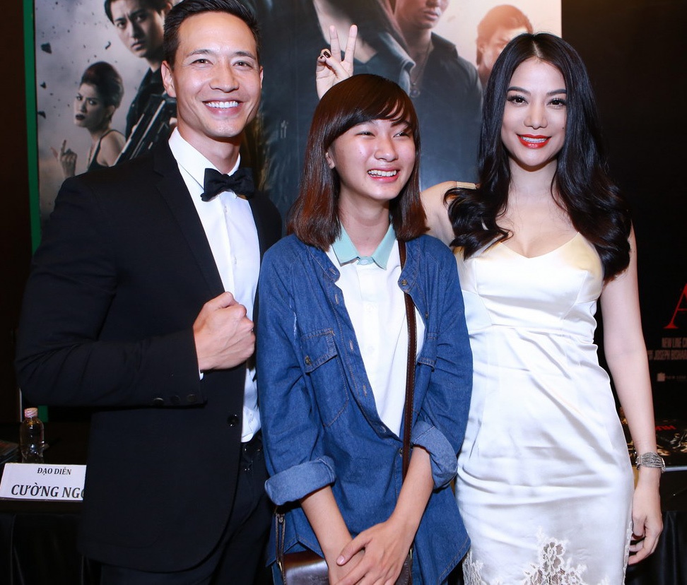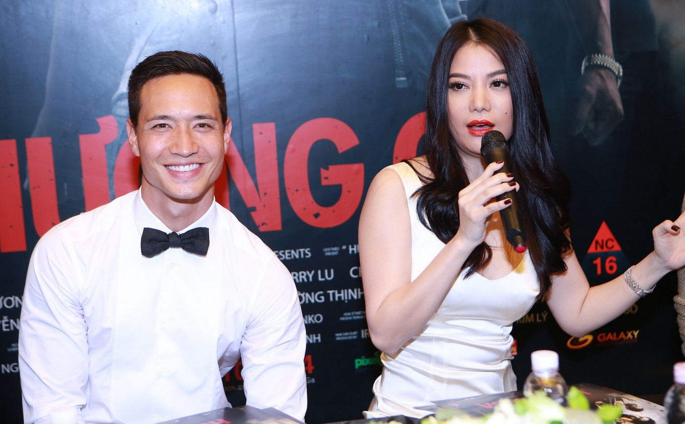 | Trương Ngọc Ánh đóng vai người phiên dịch cho bạn diễn. Kim Lý nhận được nhiều câu hỏi về đóng cảnh nóng trong phim. Nam diễn viên điển trai cho biết, anh đã chuẩn bị rất kỹ cho cảnh quay này nên quay một lần là được. |
