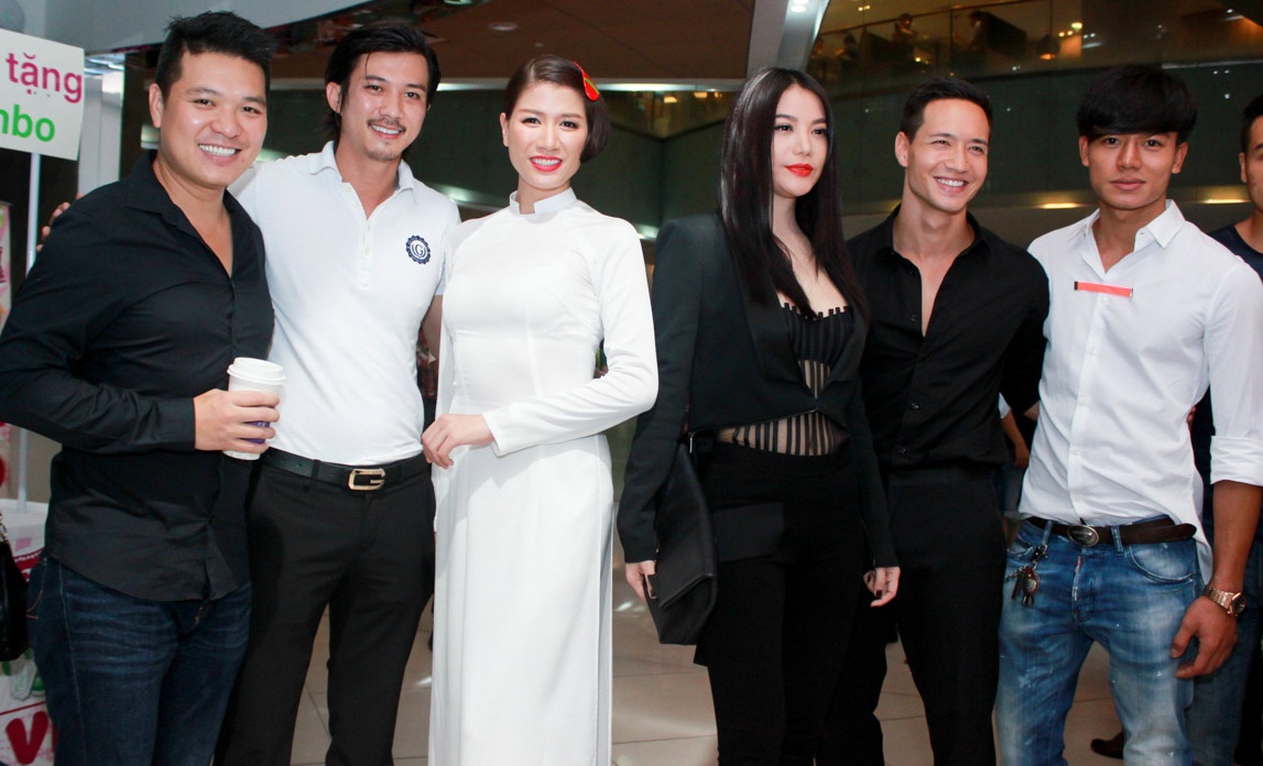 | Trang Trần diện áo dài trắng đi giao lưu. Cô chụp hình cùng nam diễn viên chính. |