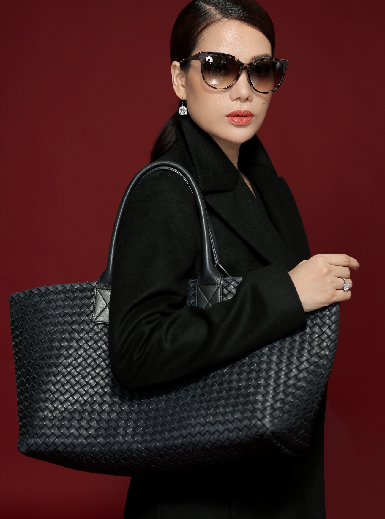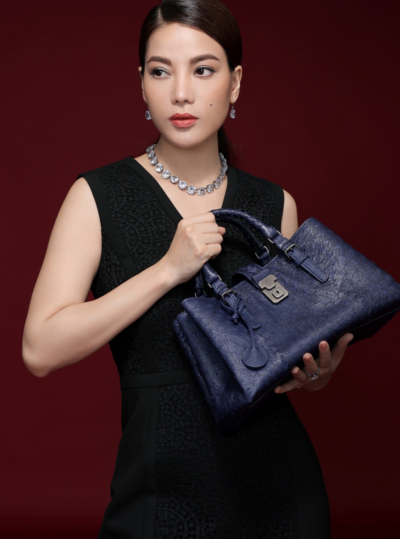 | Trong ảnh, bà mẹ một con trang điểm gợi cảm và sắc sảo. Phụ kiện hàng điệu đắt đỏ tôn hình ảnh quý phái, lịch thiệp. |