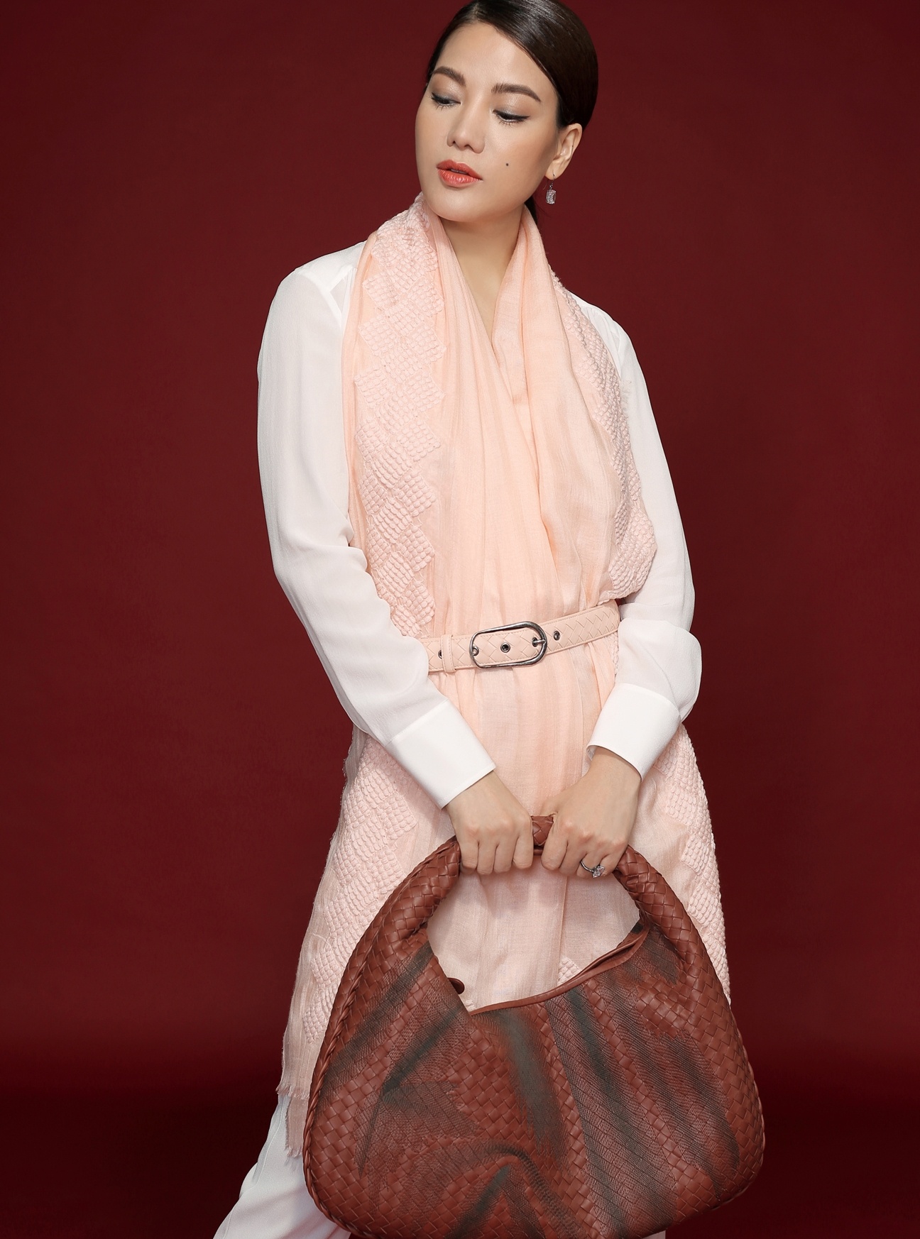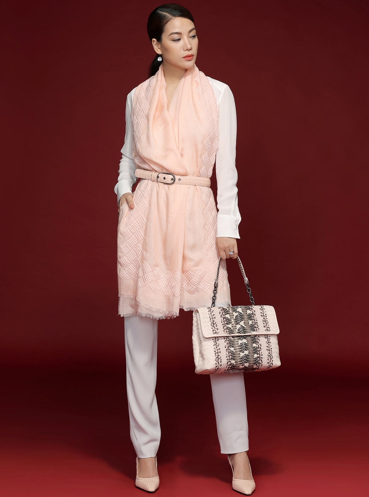 | Một trong những cách sử dụng khăn quàng cổ sáng tạo của vợ cũ doanh nhân Trần Bảo Sơn. Cô dùng khăn lụa làm áo, thắt lưng và túi xách ton sur ton. |