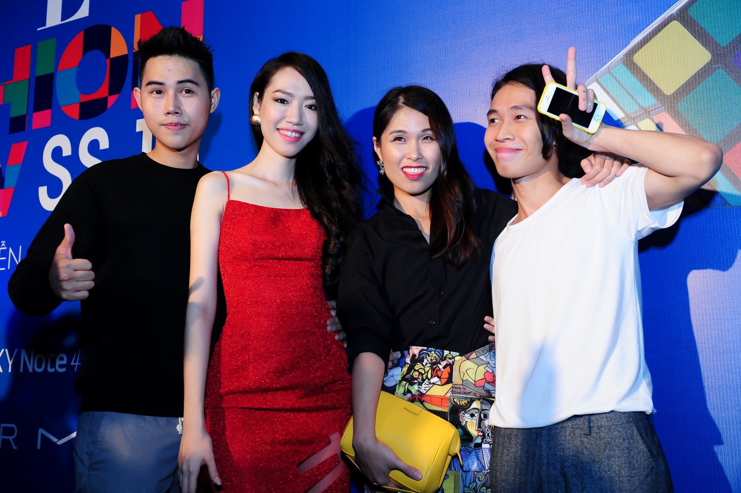 | Các nhà thiết kế tham gia giới thiệu bộ sưu tập xuân hè 2015 trên sàn diễn Elle Fashion Show còn có Lâm Gia Khang, Kim Khanh và Hoàng Tú (từ trái qua). Nhóm 3 NTK chụp ảnh cùng giám đốc sản xuất chương trình Hà Mi (áo đen, giữa). |