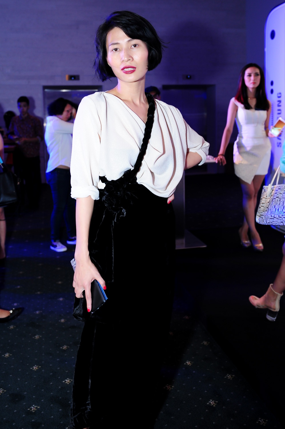 Nhà thiết kế Li Lam ấn tượng với phong cách thời trang ngẫu hứng, áo sơ-mi phối ăn ý cùng chân váy nhung tối màu.